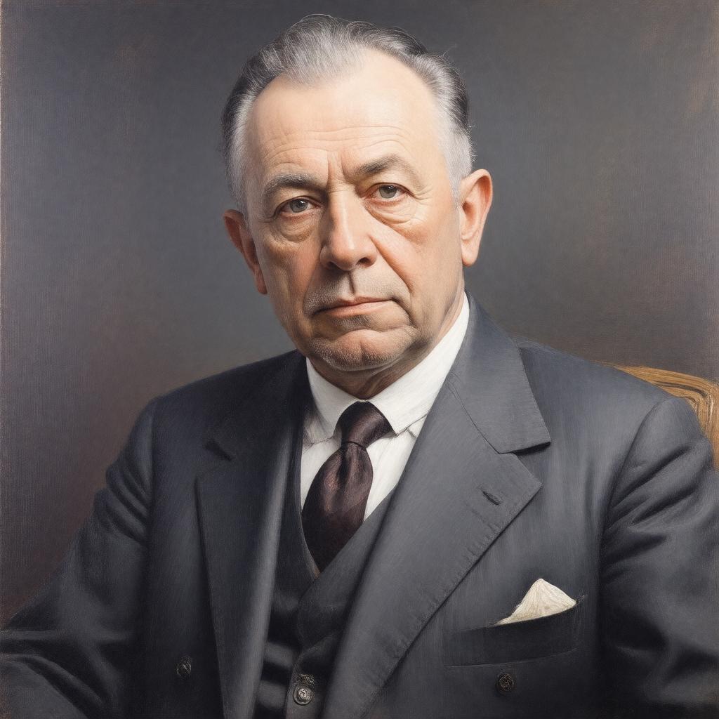 Create a realistic portrait of Édouard Herriot, a middle-aged French politician and writer, sitting in a formal setting, wearing a suit and tie, with a subtle background that hints at his connection to Lyon, France, and his notable literary works, in the style of a classic French painting from the early 20th century.