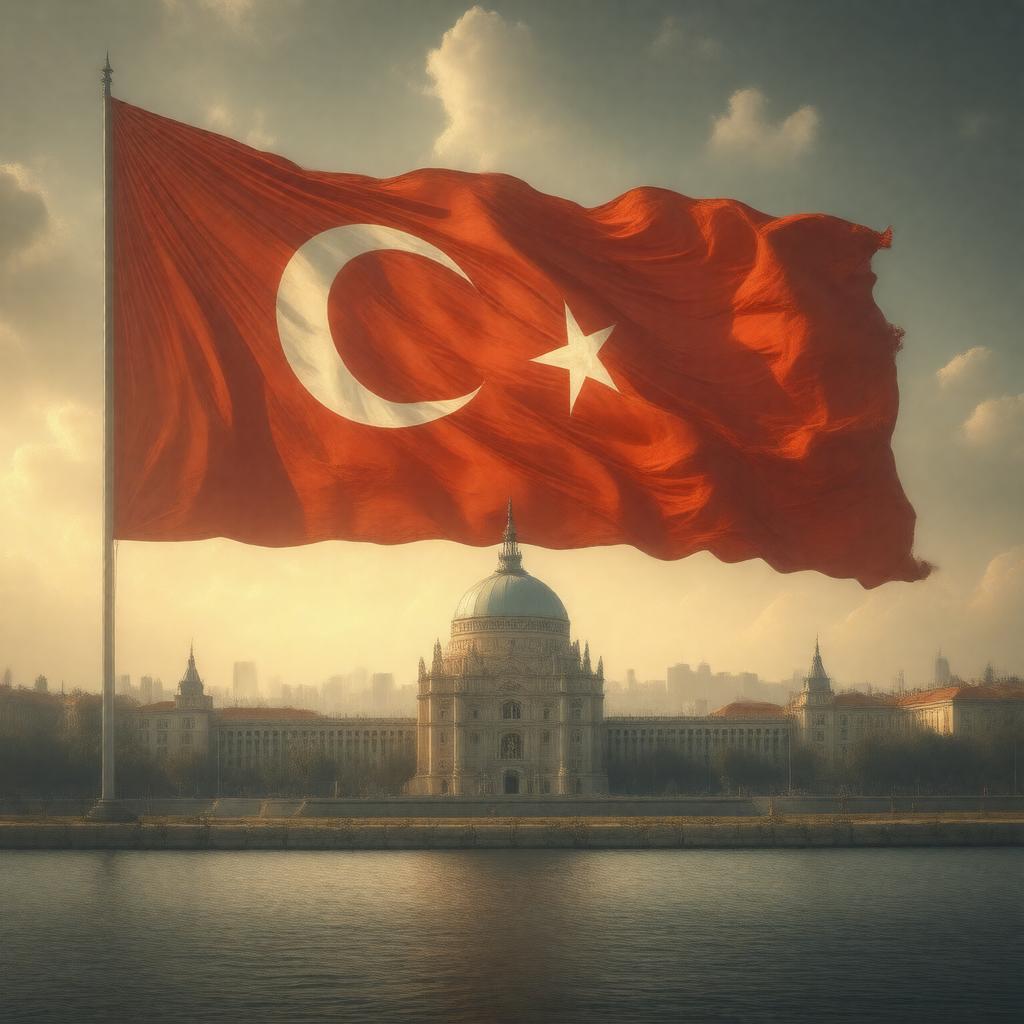 Generate an image of a majestic, golden-lit Turkish flag waving in the foreground, with a subtle, faded image of the Turkish Parliament building or a similar national monument in the background. In the center of the flag, a stylized, bold font displays the lyrics "Korkma, Sönmez bu şafaklarda yüzen Türk'ün istiklal ateşi" (Do not fear, this dawn's flame of Turkish independence will never fade), echoing the powerful opening lines of İstiklâl Marşı. The overall style should be a mix of realism and symbolic representation, conveying patriotism, freedom, and national pride.