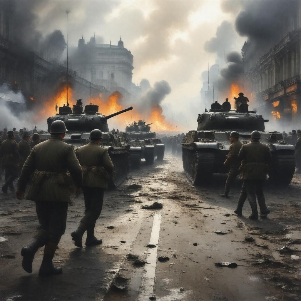 "Create an image depicting a dramatic and intense scene of the 1956 Hungarian Revolution, specifically showing a group of Hungarian protesters facing off against Soviet tanks in a Budapest street, with smoke and flames rising in the background, and a sense of chaos and urgency in the air, in a gritty and realistic style."