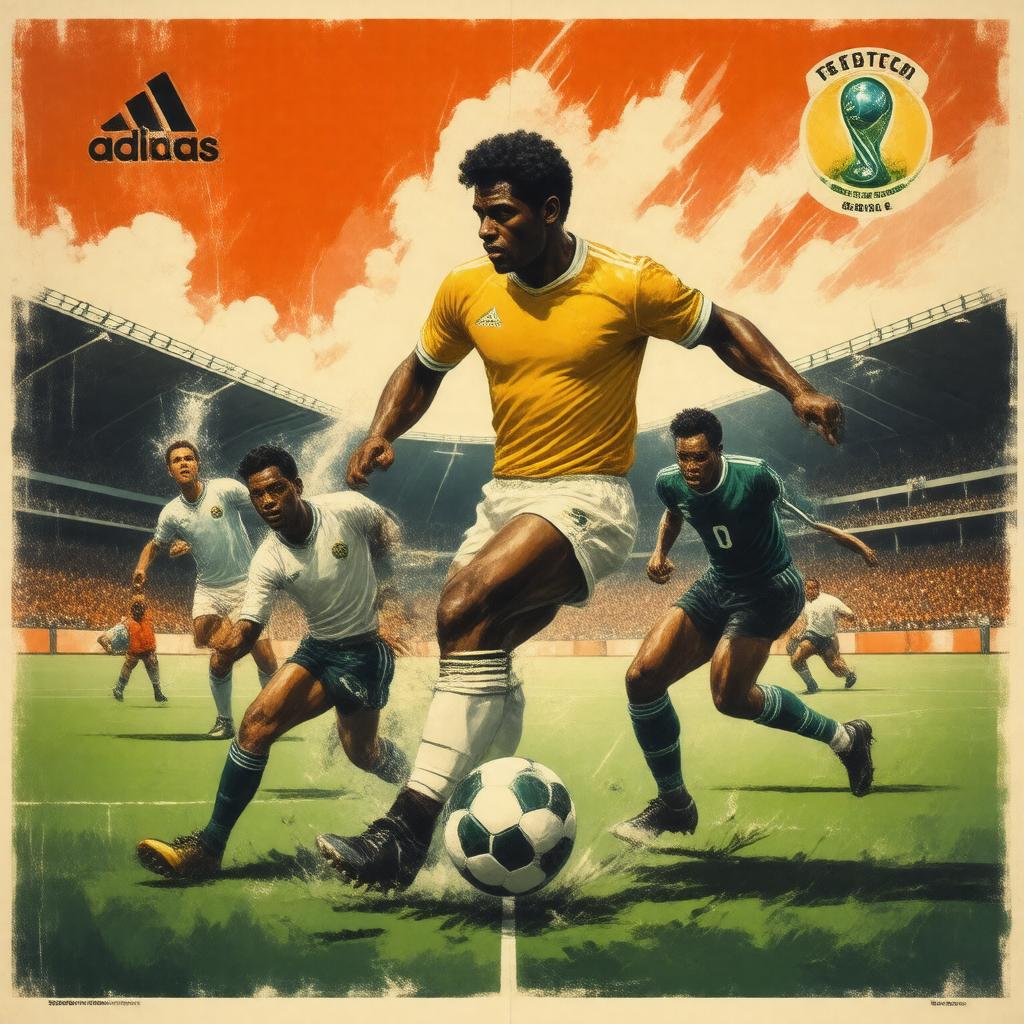 "Generate an image of a vintage-style poster for the 1970 FIFA World Cup, featuring a iconic Brazilian football team in action, with the Estadio Azteca in the background, and incorporating the Adidas Telstar ball and the tournament's official logo, in a colorful and dynamic style reminiscent of the era."