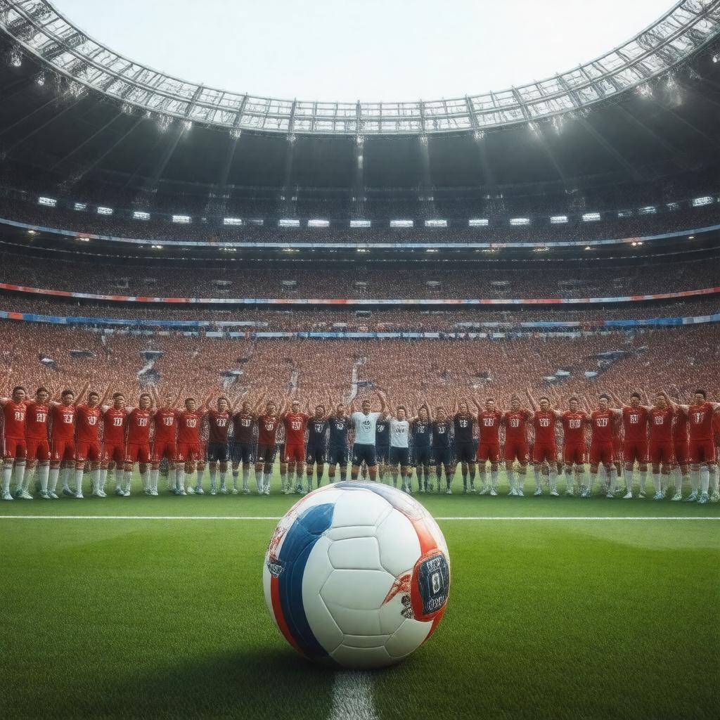 "Generate an image of a soccer stadium with a large crowd, featuring the French national team celebrating their World Cup victory in 1998, with the iconic Adidas Tricolore ball and the Stade de France in the background, symbolizing the 1998 FIFA World Cup."