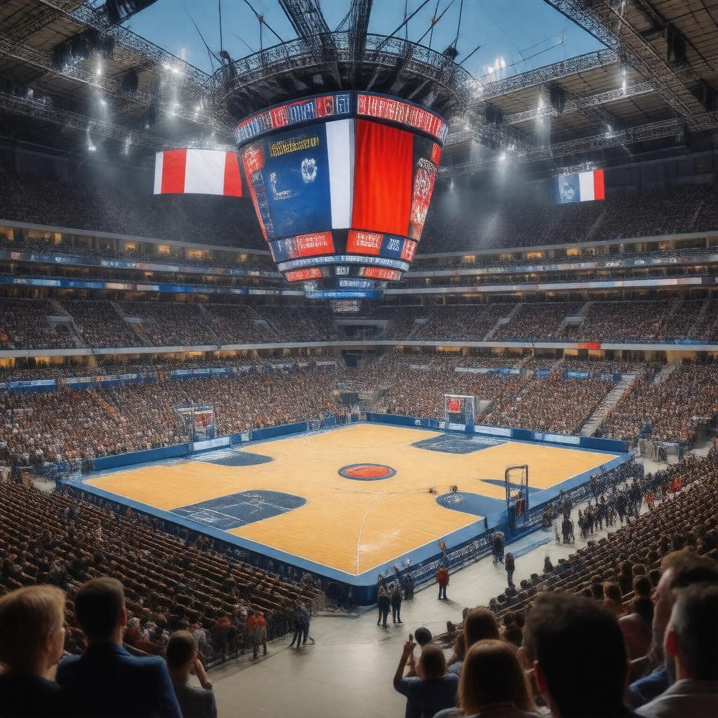 "Generate an image of a packed basketball arena with a scoreboard displaying a thrilling match, surrounded by cheering crowds, with the French, German, Croatian, and Latvian flags visible in the stands, set against the backdrop of a European cityscape, representing the 2015 EuroBasket tournament."