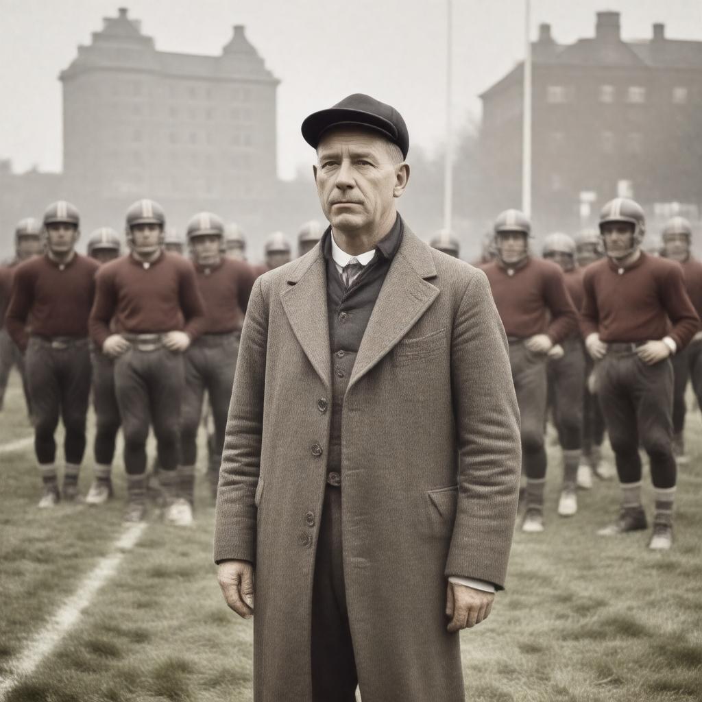 Generate a realistic image of a vintage American football coach from the early 20th century, specifically depicting A. Schuyler Dunning, with a background that suggests a collegiate setting, possibly the Princeton University or the University of Richmond, in a style reminiscent of photographs from the 1900s, with the coach wearing period-specific attire, standing in a confident pose, possibly with a football team in the background, reflecting his 1909 coaching record of 3–5–2.