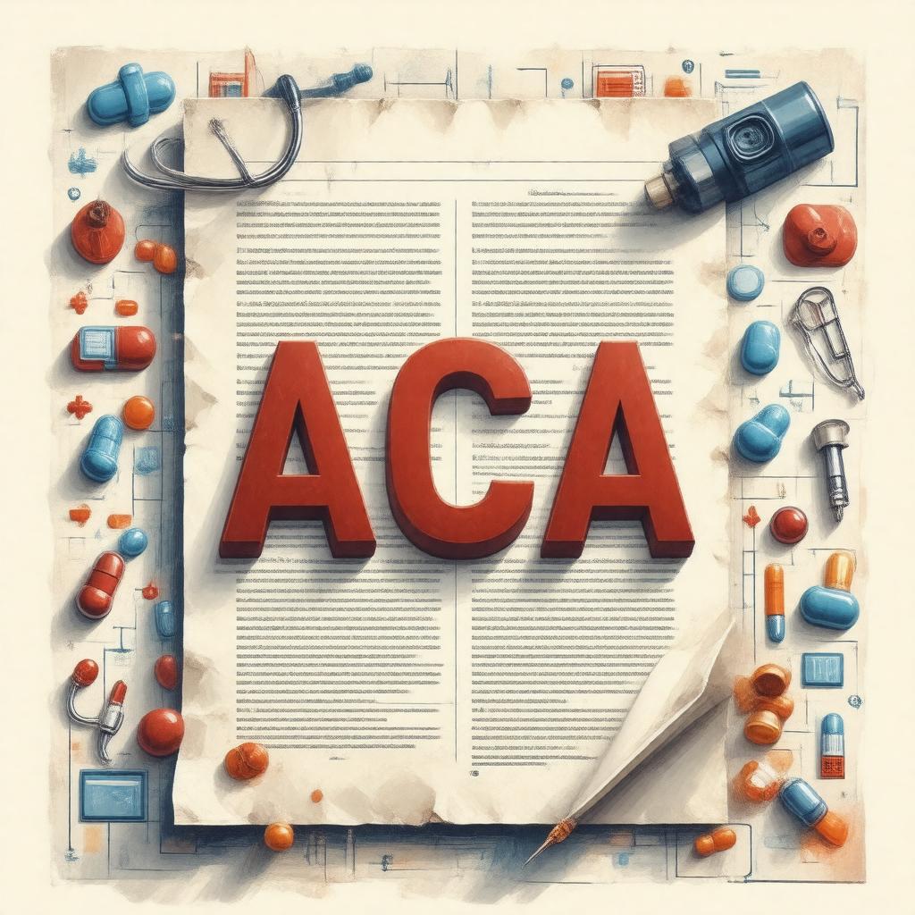 "Generate an image of a stylized document with the letters 'ACA' prominently displayed, surrounded by subtle medical and healthcare-related symbols, representing the Affordable Care Act, with a clean and professional style."