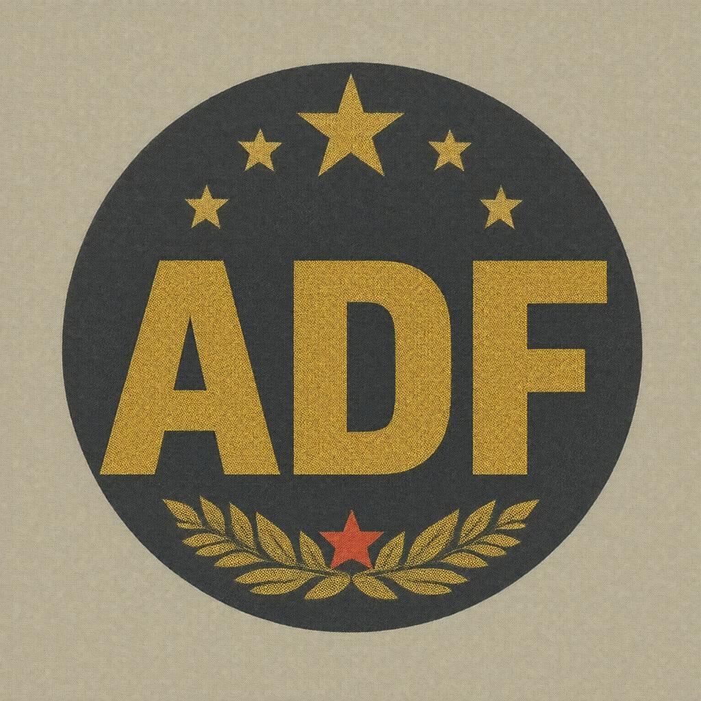 "Generate an image of a military-themed logo or insignia with the letters 'ADF' prominently displayed, incorporating elements that reflect the Australian Defence Force, such as the country's flag or military uniforms, in a realistic and formal style."