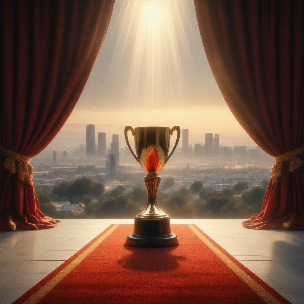 "Generate an image of a prestigious award ceremony, with a spotlight shining on a gleaming, golden trophy or statuette, surrounded by a red carpet, elegant drapes, and a cityscape of Los Angeles in the background, symbolizing the AFI Life Achievement Award, a renowned film award presented annually by the American Film Institute to honor a single individual's lifetime contribution to enriching American culture through motion pictures and television."