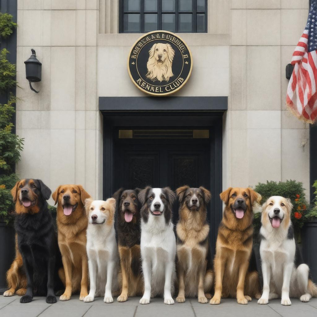 "Generate an image of the American Kennel Club (AKC) headquarters in New York City, with a group of purebred dogs of various breeds, such as Labrador Retrievers, German Shepherd Dogs, and Golden Retrievers, in front of a building with a sign reading 'American Kennel Club' and a logo of a dog, in a realistic and formal style, representing the organization's purpose as a breed registry and its focus on purebred dogs."