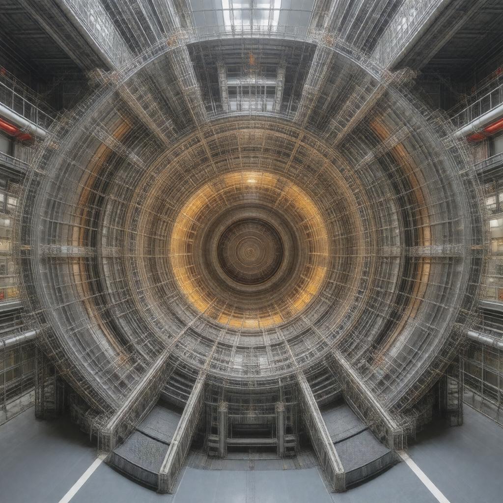 "Generate an image of the ALICE experiment, a large particle physics experiment located at CERN, featuring its massive detector, a Time Projection Chamber, Inner Tracking System, Electromagnetic Calorimeter, and Muon Spectrometer, with lead ions and protons colliding in the Large Hadron Collider, surrounded by a massive structure that weighs 10,000 tons, is 26 meters long, 16 meters high and wide, and is a collaboration of over 1700 scientists from more than 40 countries, with the goal of studying quark-gluon plasma and properties of QCD matter at extreme energy densities."