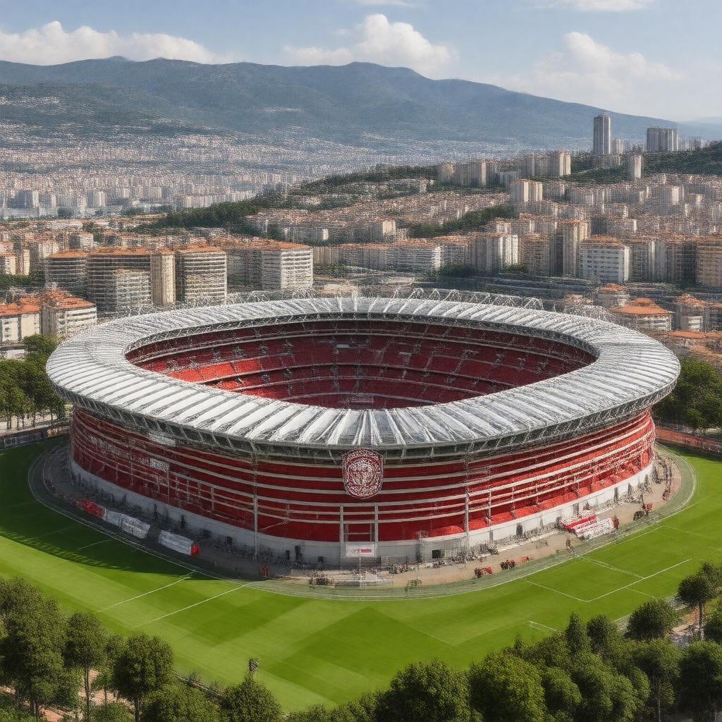 "Generate an image of the exterior of Stade Louis II, the home stadium of AS Monaco football club, located in Fontvieille, Monaco, with the Monaco cityscape in the background, during a Ligue 1 match, incorporating the club's colors, red and white, and showcasing the stadium's capacity of 18,523, in a realistic and modern style."