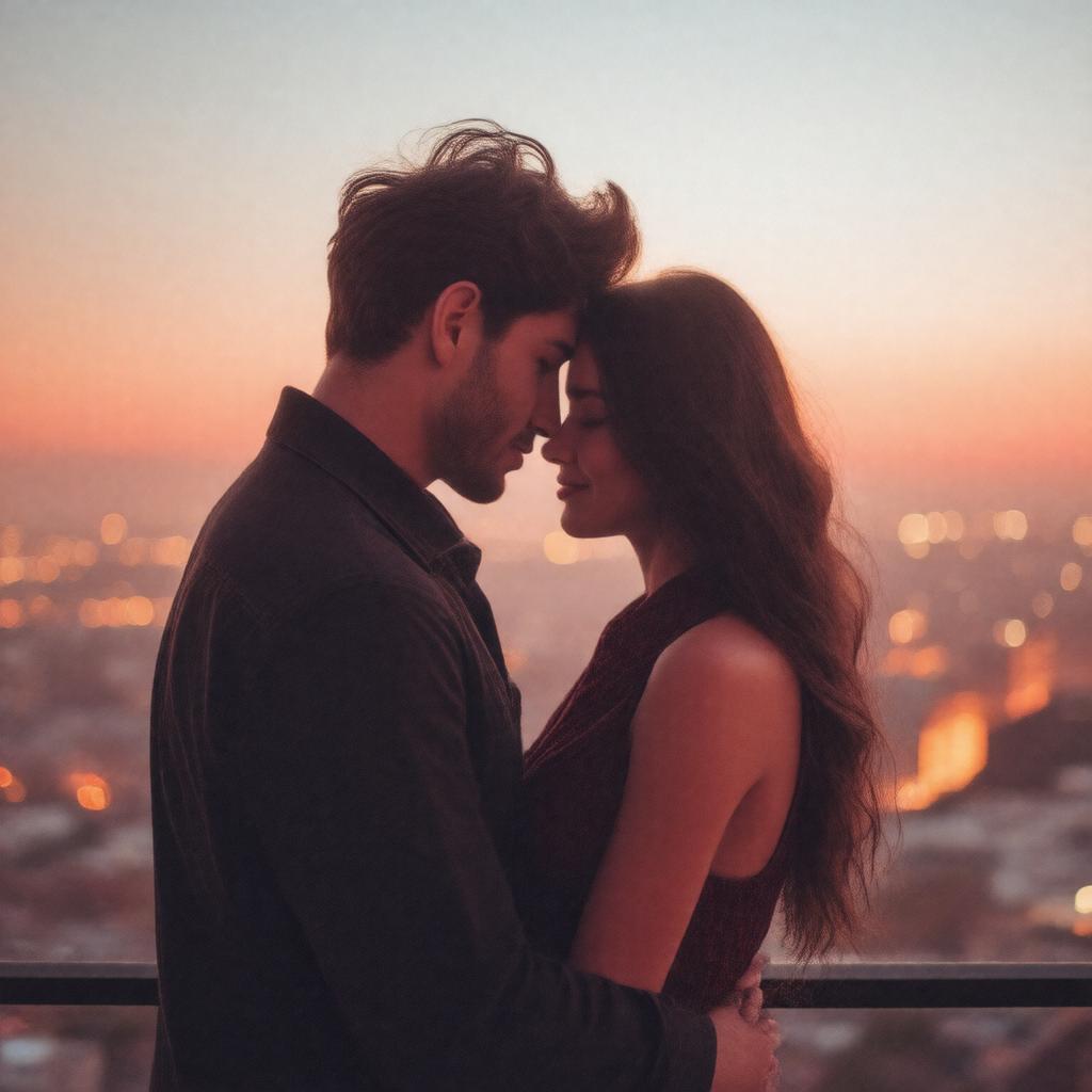 "Generate an image of a romantic couple embracing in a dimly lit, intimate setting, with a subtle cityscape at dusk in the background, representing the theme of 'A Deeper Love', a song by Clivillés & Cole, in a warm and sensual 90s-inspired aesthetic."