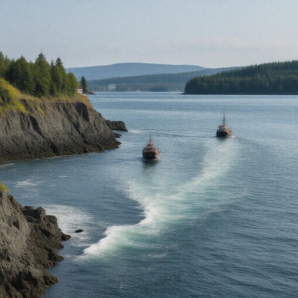 "Generate a realistic image of a scenic inlet, specifically Admiralty Inlet, with Whidbey Island on one side and the Olympic Peninsula on the other, featuring a lighthouse in the distance, with a few boats navigating through the water, highlighting the strong tidal currents, in a style reminiscent of a serene natural landscape photograph."
