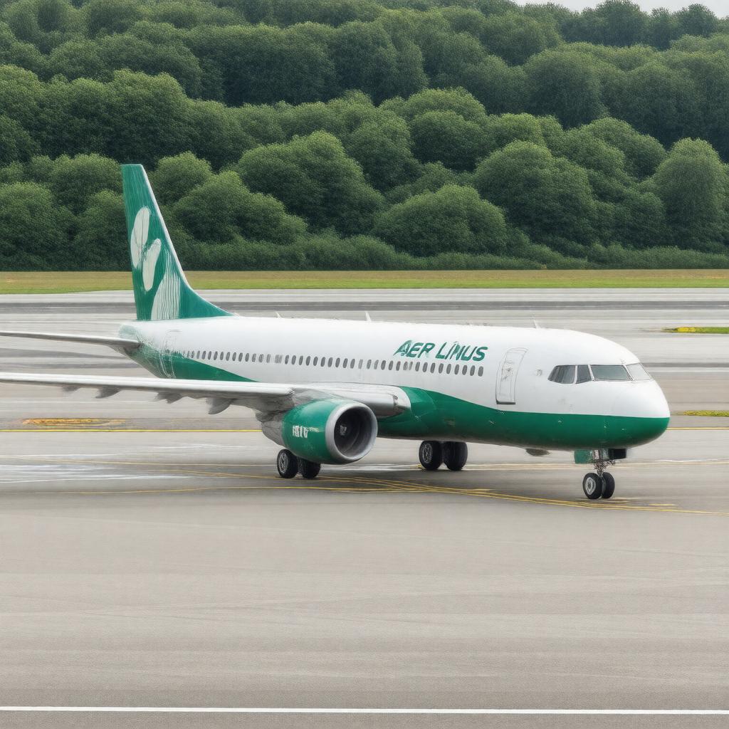 "Generate an image of a regional airliner, specifically an Aer Lingus Regional plane, with a distinctive green and white livery, parked at a terminal gate at Dublin Airport, one of its main hubs, with a backdrop of lush Irish greenery, in a realistic style."