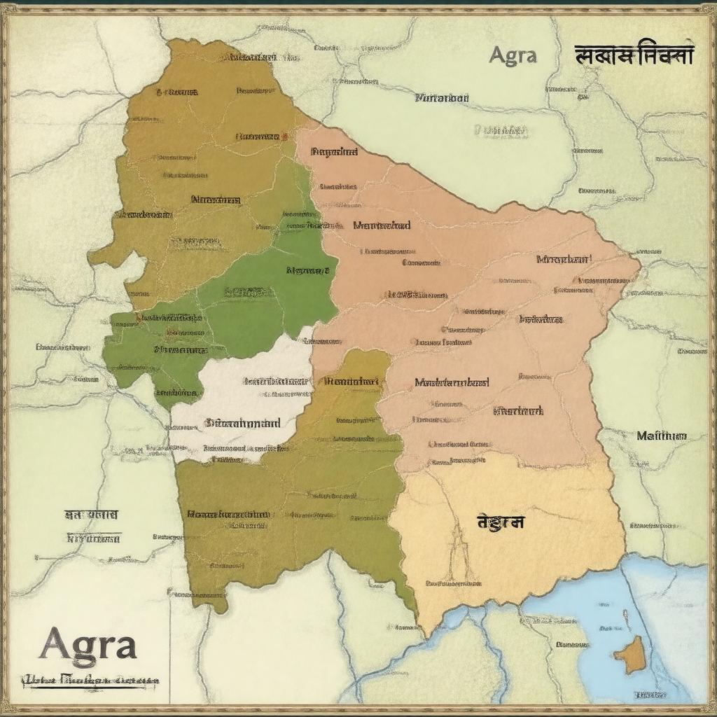 "Generate an image of a map of Agra division, located in Uttar Pradesh, India, highlighting its districts including Agra, Firozabad, Mainpuri, and Mathura, with Agra as the headquarters, in a realistic style, incorporating the Braj region's cultural essence, with Hindi script and IST timezone notation."