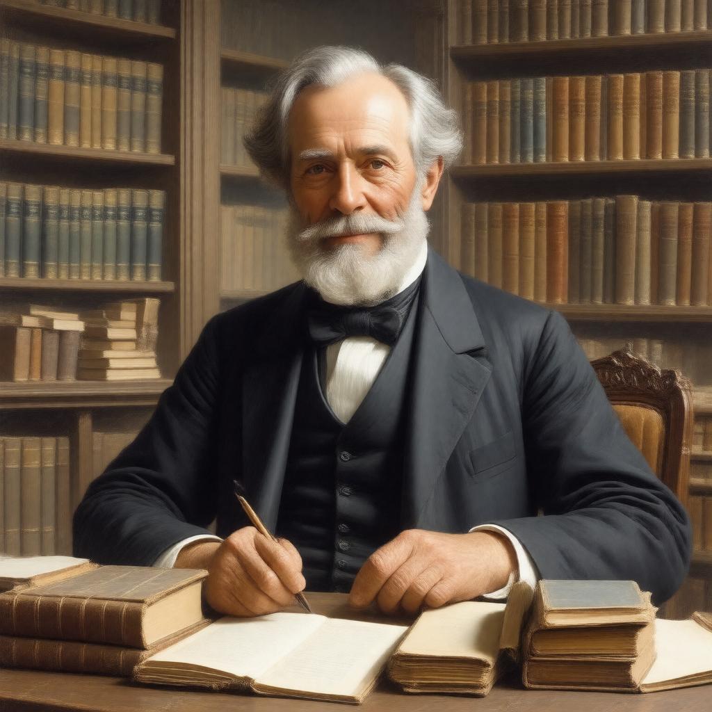 Generate a realistic portrait of Ainsworth Rand Spofford, a middle-aged American man from the 19th century, dressed in formal attire, sitting in a library or study with books and papers around him, conveying a sense of intelligence and authority, with a hint of a smile, reflecting his contributions to literature and librarianship, specifically his notable work on "The American Almanac and Treasury of Facts" and his role as the Librarian of Congress.