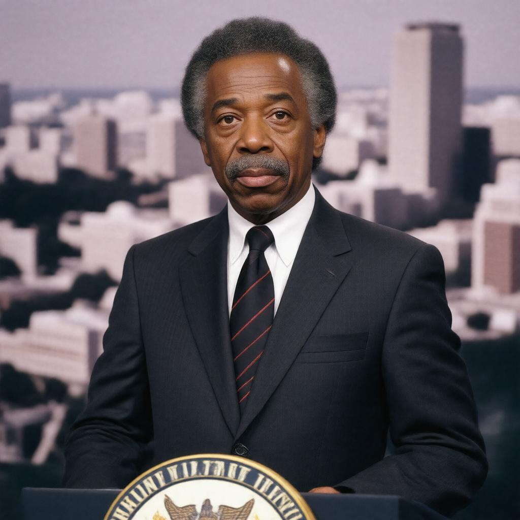 "Generate a realistic image of Al Sharpton, an American Baptist minister, civil rights activist, and television host, standing at a podium with a determined expression, wearing a suit and a clerical collar, with a subtle background of a cityscape, symbolizing his advocacy for racial justice and civil rights, in a formal and dignified style."