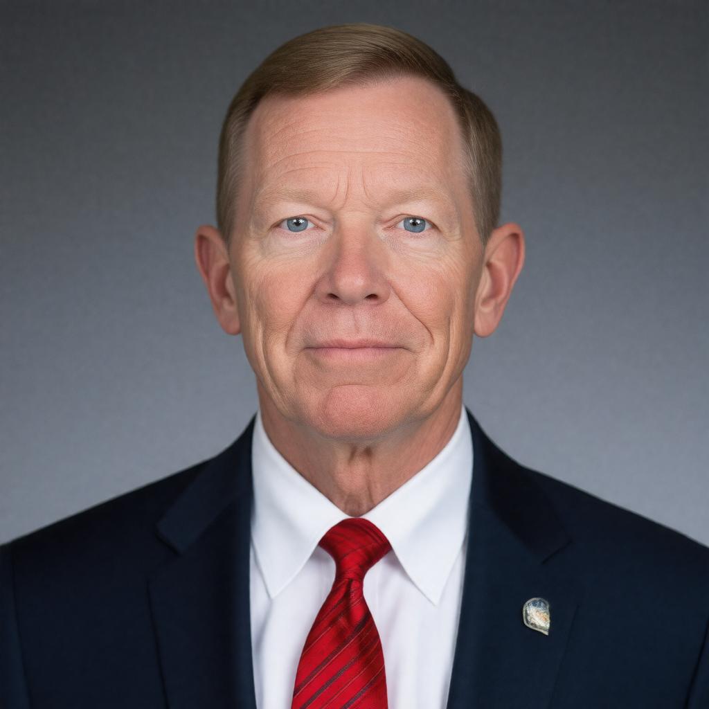"Generate a realistic portrait of Alan Mulally, a middle-aged American business executive with a distinguished career, wearing a formal suit and tie, with a confident and approachable demeanor, in a style reminiscent of a professional headshot or a photograph from a business magazine, incorporating subtle hints of his achievements and leadership experience at Ford Motor Company and Boeing."