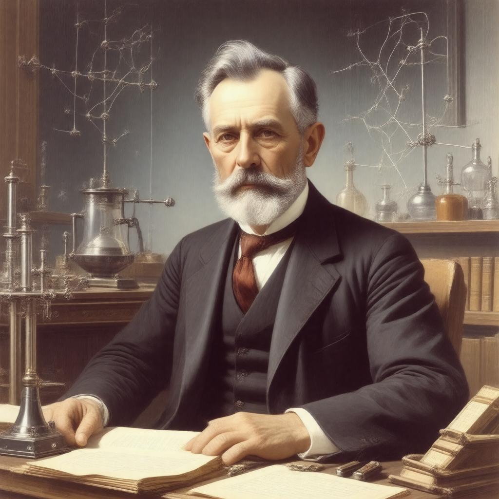 Create a realistic image of Albert A. Michelson, a middle-aged man with a dignified expression, wearing formal attire, possibly a suit and tie, sitting in a study or laboratory setting with scientific instruments and papers around him, reflecting his work in physics, specifically with elements hinting at his notable experiments such as the Michelson–Morley experiment or his work with the Michelson interferometer.