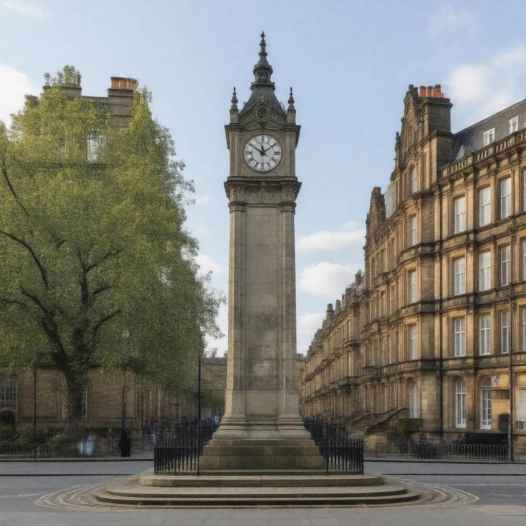 "Generate an image of a Gothic Revival-style stone monument in the shape of a clock tower, specifically the Albert Memorial Clock, standing 113 feet tall with a notable lean, located in Queen's Square, Belfast, Northern Ireland, with a grandiose and historic appearance, reflecting its Grade A status and restoration in 2002."