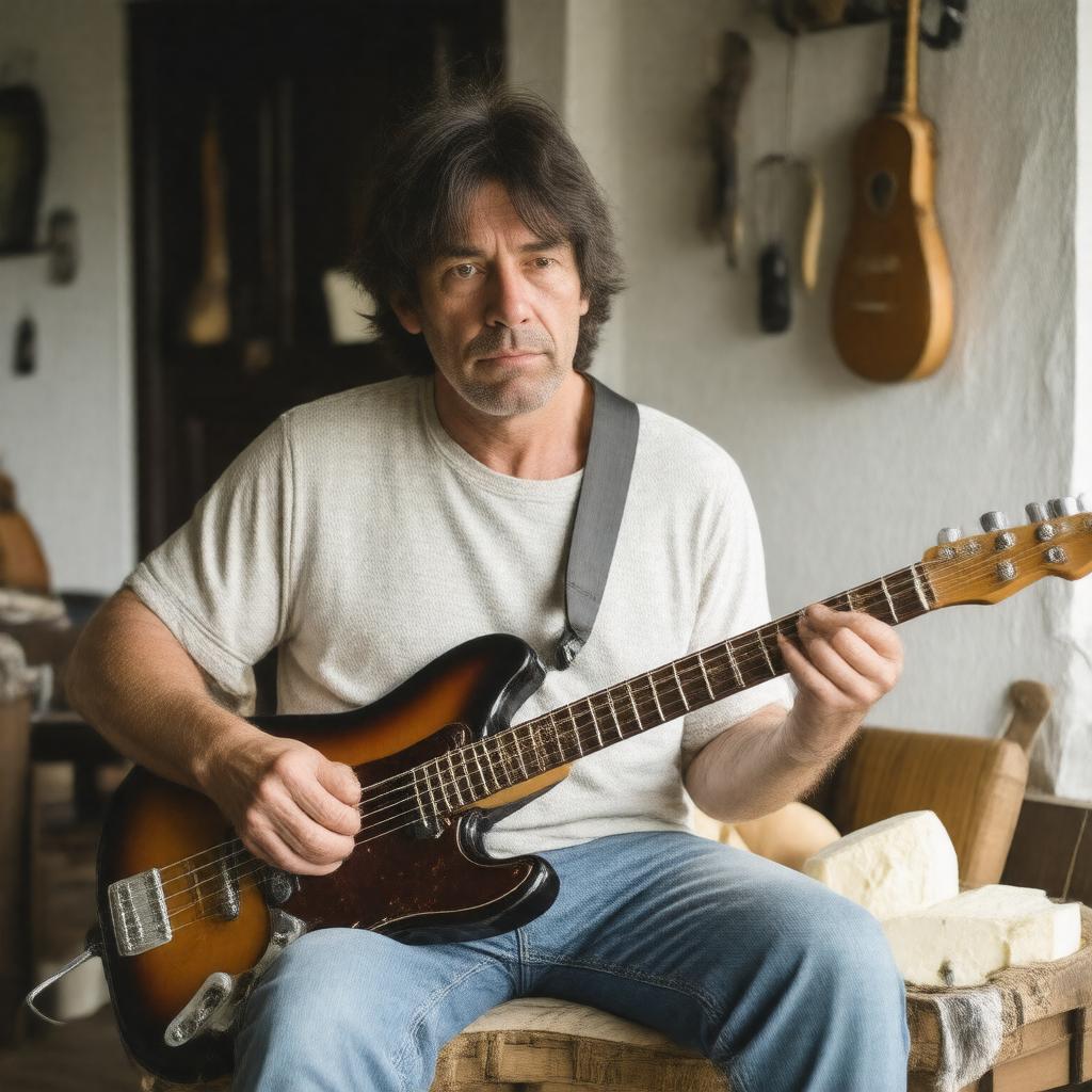 Generate a realistic image of a British musician in his mid-50s, with a casual, laid-back expression, playing a bass guitar, with a subtle background hinting at his connection to music and cheesemaking; Alex James, the bassist of Blur, sitting in a rustic English setting, perhaps with a few cheese-making tools or a guitar nearby, with a warm and earthy color palette.