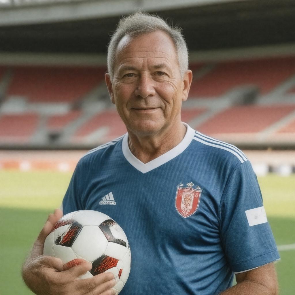 Generate an image of a middle-aged Belarusian man with a height of around 1.85m, wearing a football jersey and holding a football, with a subtle background of a football stadium; the man has a gentle smile and is looking directly at the camera, symbolizing his retired life as a footballer; style: realistic portrait.