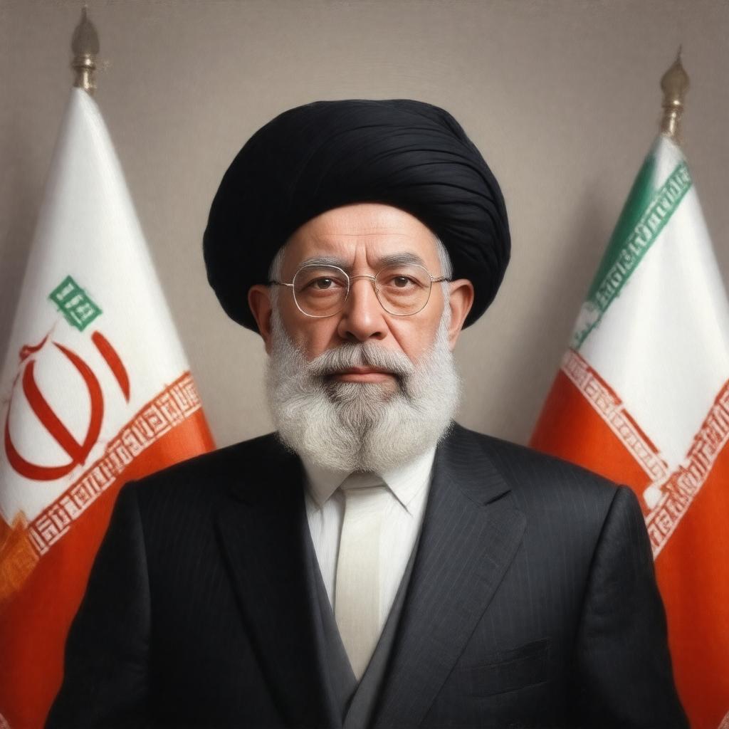 "Generate an image of Sayyid Ali Hosseini Khamenei, the Supreme Leader of Iran, standing in a formal setting, wearing a black turban and a suit, with a serious expression, surrounded by Iranian flags and symbols of the Islamic Republic, conveying authority and leadership."