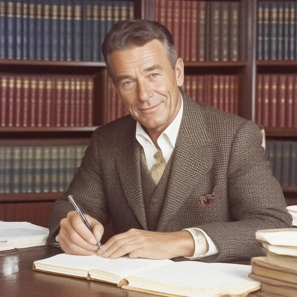 Create a realistic image of a middle-aged Scottish man in the 1960s, sitting at a desk with a pen in hand and a notepad in front of him, surrounded by books and papers. He has a rugged, experienced look, with a hint of a smile. He is wearing a classic tweed jacket and a crisp white shirt. In the background, there is a bookshelf filled with his notable works, including "The Guns of Navarone", "Where Eagles Dare", "Ice Station Zebra", "HMS Ulysses", and "Force 10 from Navarone". The overall atmosphere should convey a sense of literary intensity and adventure.