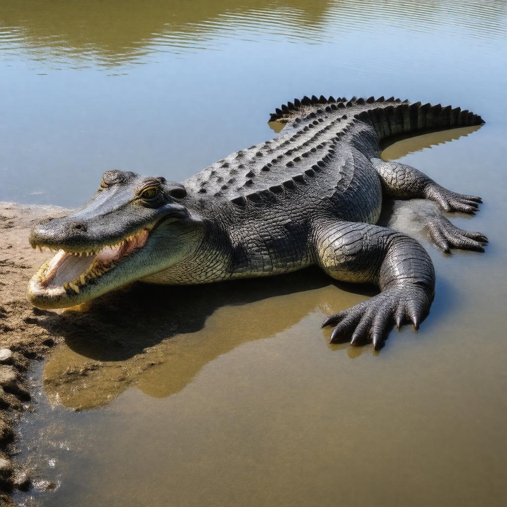 "Generate an image of a large American alligator (Alligator mississippiensis) basking in the sun on the banks of a freshwater lake in the southeastern United States, showcasing its broad, U-shaped snout, armored skin, and powerful build, with a subtle hint of its webbed feet and sharp teeth, in a realistic and detailed illustration style."