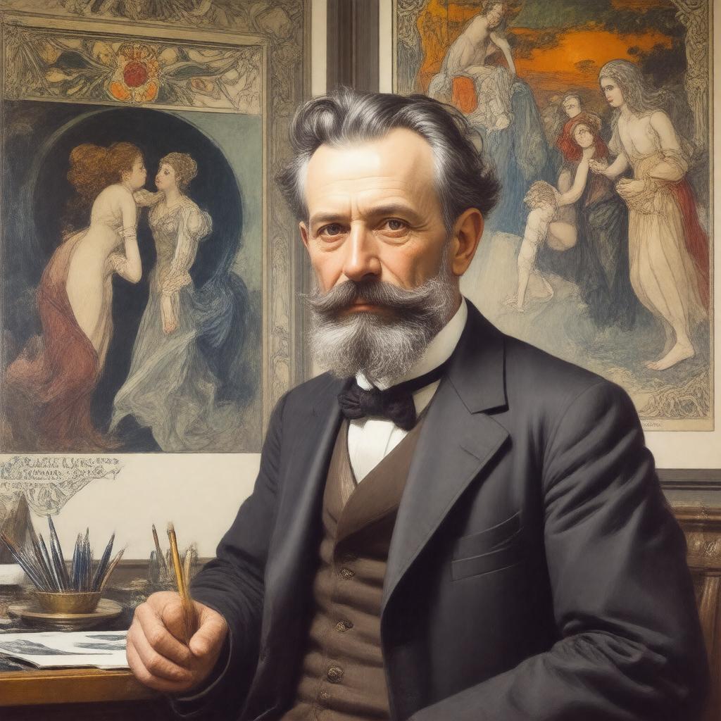 "Portrait of Alphonse Mucha, a Czech artist and painter, in his studio, surrounded by Art Nouveau posters and designs, wearing a suit and holding a pencil, with a warm and gentle expression, in a realistic style with subtle Art Nouveau influences."