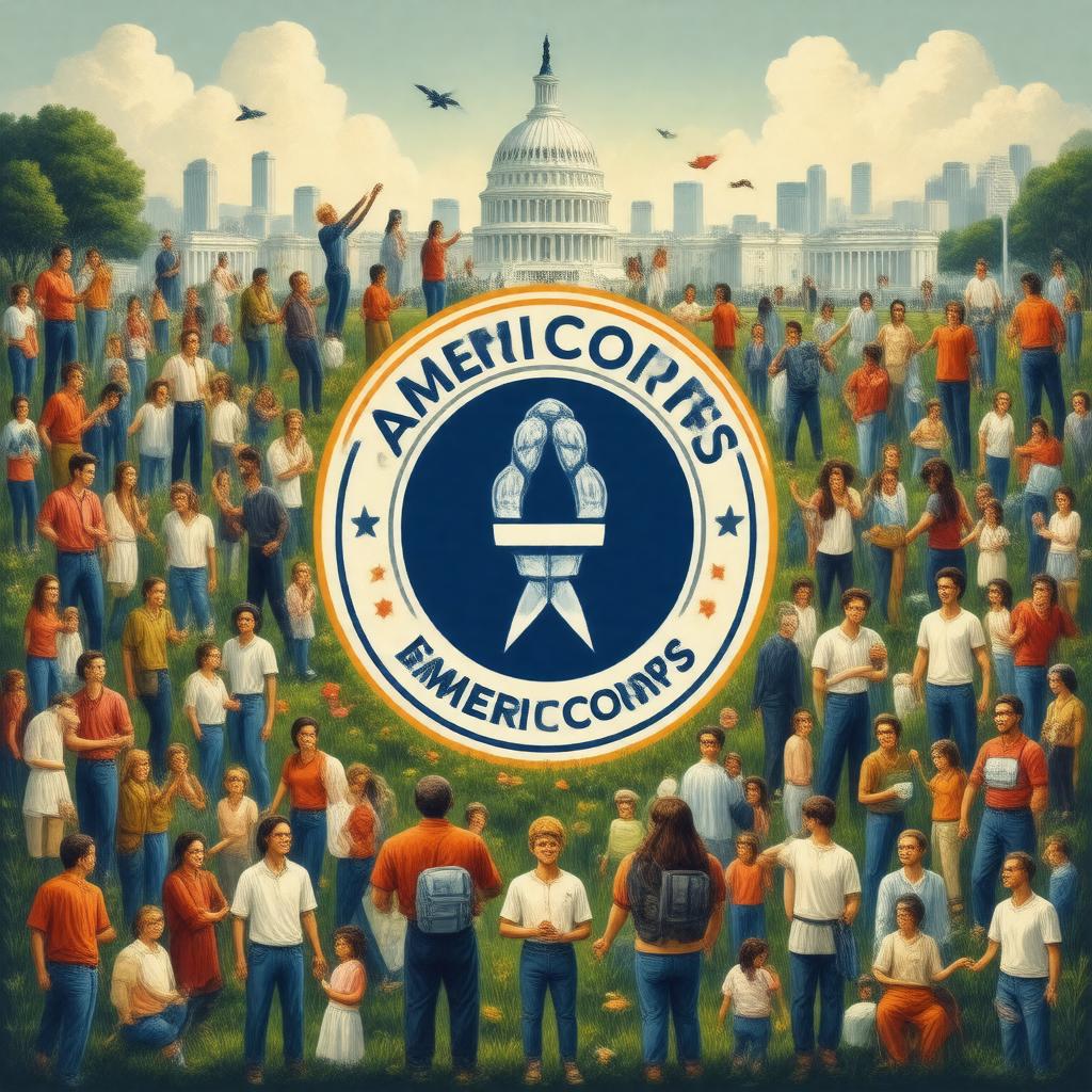 "Generate an image of the AmeriCorps logo, a stylized representation of the organization's commitment to community service, with a backdrop of diverse individuals from different age groups and ethnicities engaged in various volunteer activities such as environmental conservation, education, and public safety, with a subtle outline of the Washington, D.C. skyline, in a vibrant and dynamic style that conveys a sense of unity, purpose, and service."