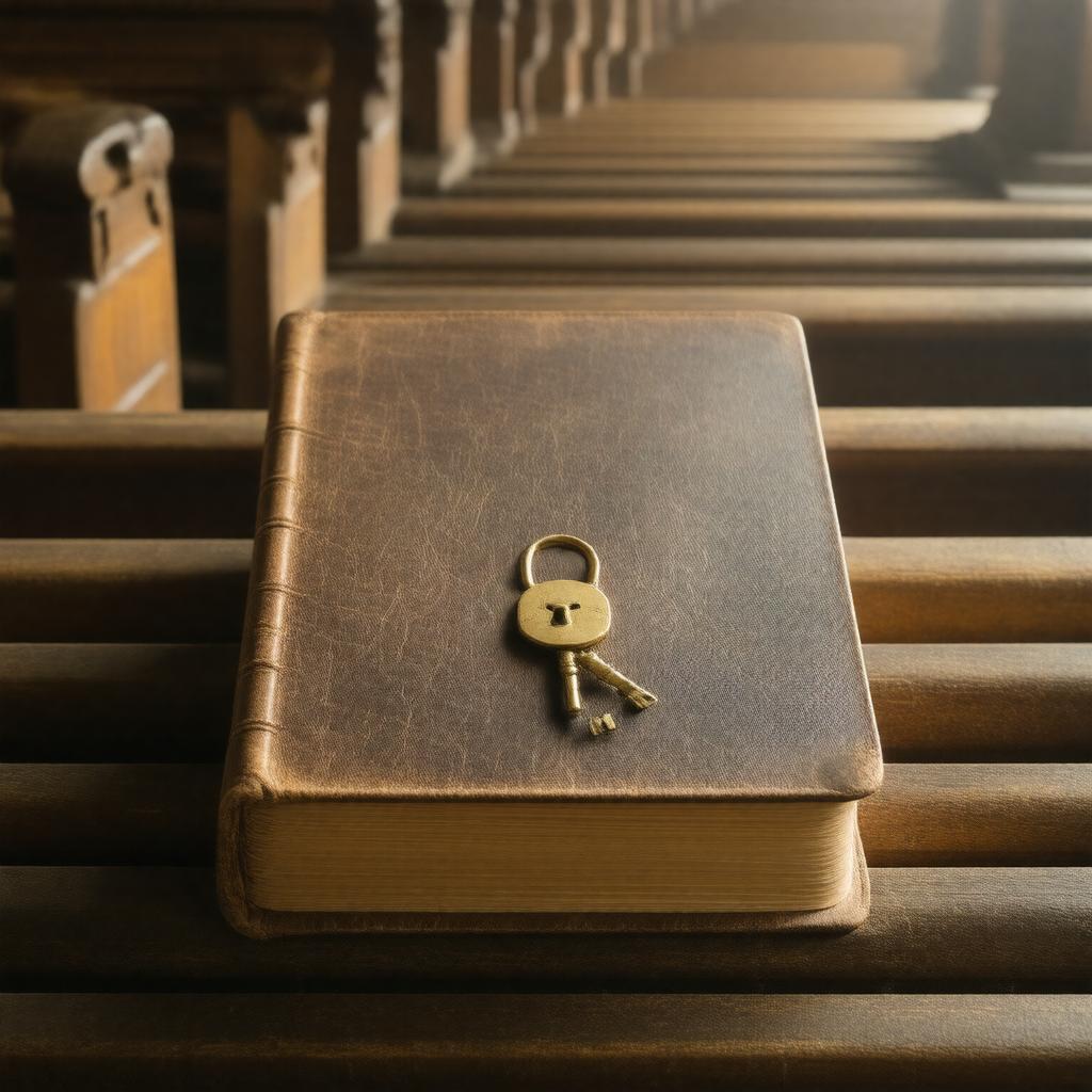 Create an image of a vintage, leather-bound Bible with a gold lock and key, surrounded by classic, wooden church pews, with a subtle, warm lighting effect, representing the American Standard Version (ASV) of the Hebrew Bible, published in 1901, with a notable emphasis on its literal translation style and use of the divine name "Jehovah".