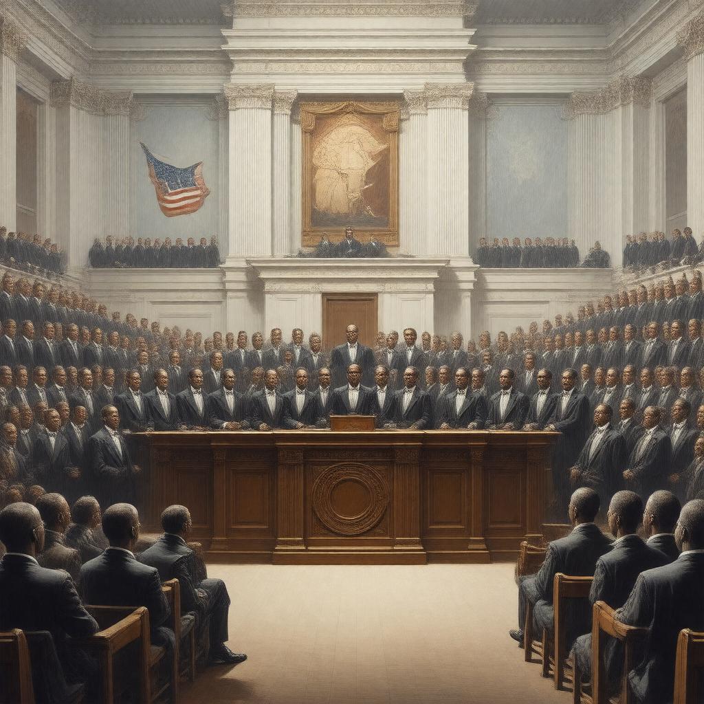 "Create an image of a dramatic courtroom scene with a large, ornate desk at the front and rows of seats for spectators and judges. In the center of the image, depict a group of Africans, led by Cinqué, standing confidently, surrounded by their lawyers, including John Quincy Adams and Roger Sherman Baldwin. In the background, show the United States Supreme Court judges' bench, with a large American flag and a subtle hint of a map of Africa or a slave ship in the distance. The style should be realistic and evocative of a 19th-century American courtroom, with warm, muted colors and detailed textures, conveying a sense of tension, hope, and the struggle for freedom and justice, highlighting the significance of the Amistad case in American history."