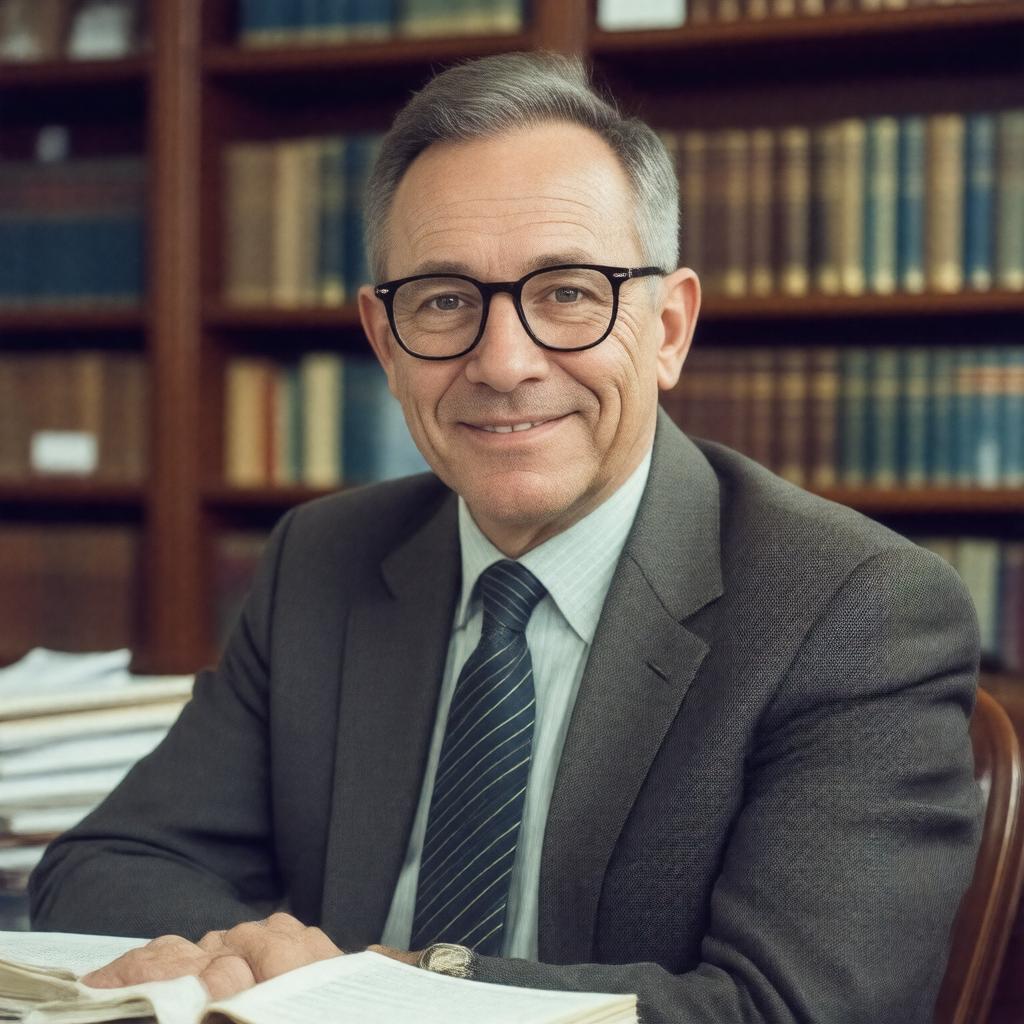 A portrait of Amos Tversky, a middle-aged man with a gentle smile, wearing a pair of glasses and a suit, sitting in a library or office with books and papers around him, with a warm and introspective lighting, in a realistic and formal style.