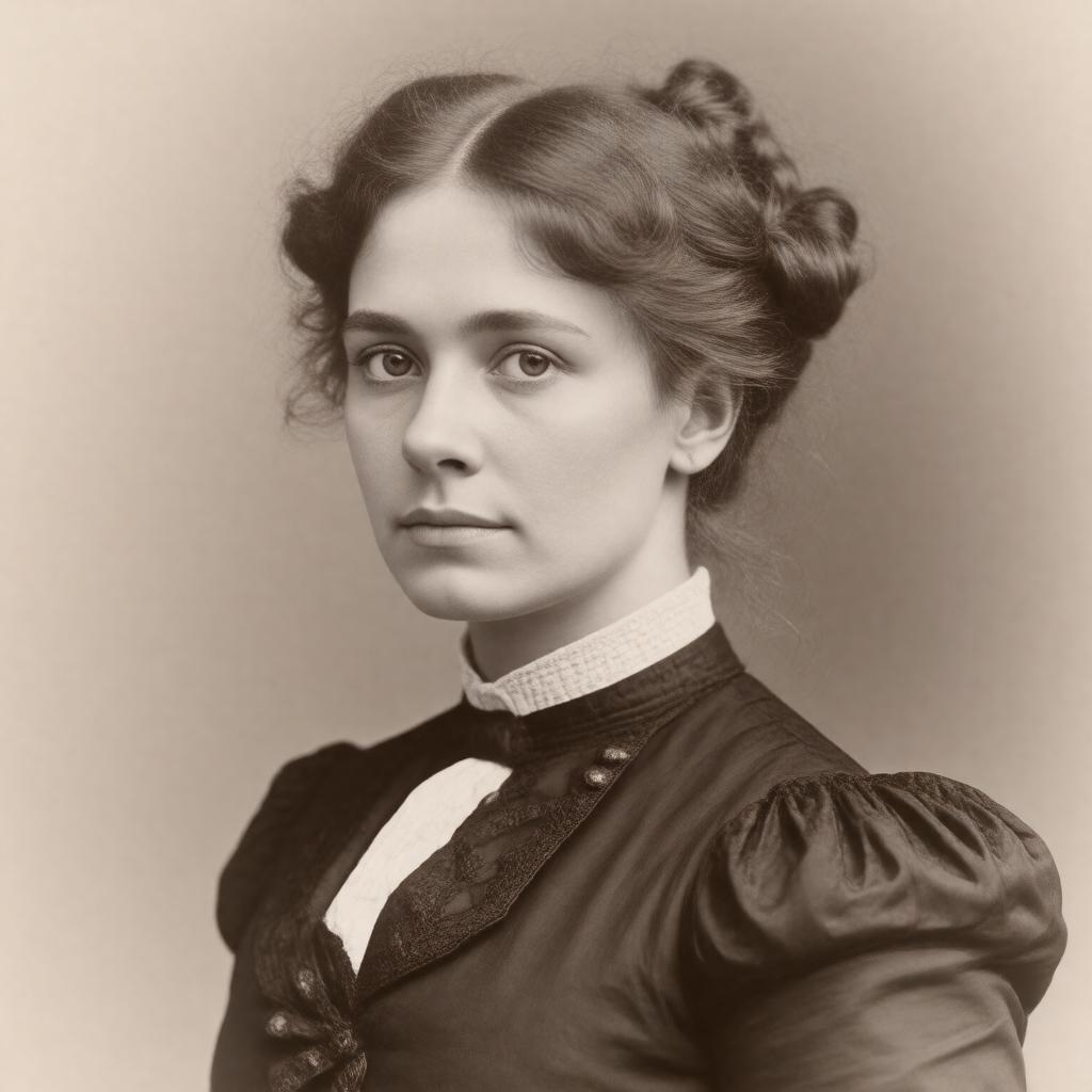 Generate a realistic portrait of a British woman from the late 19th and early 20th centuries, depicting Amy Catherine Robbins, wife of renowned author H.G. Wells, in a dignified and elegant style reminiscent of Victorian-era photography, showcasing her features as a writer and intellectual of her time.