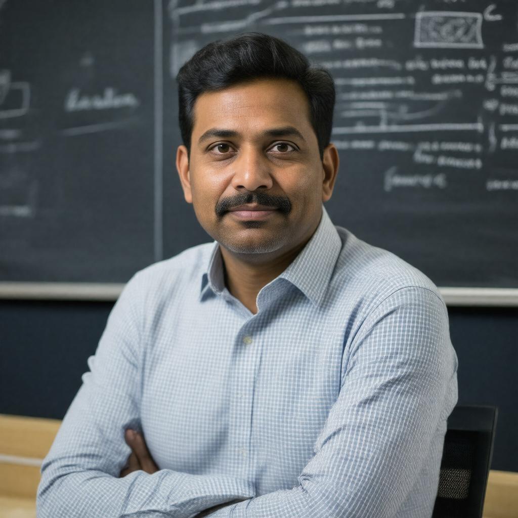 "Generate a realistic portrait of Anant Agarwal, an Indian computer scientist and professor, in a professional setting, possibly in front of a blackboard or a computer screen, with a subtle background that hints at his connection to MIT or edX, in a style that reflects his Indian and American heritage, with a serious yet approachable expression."