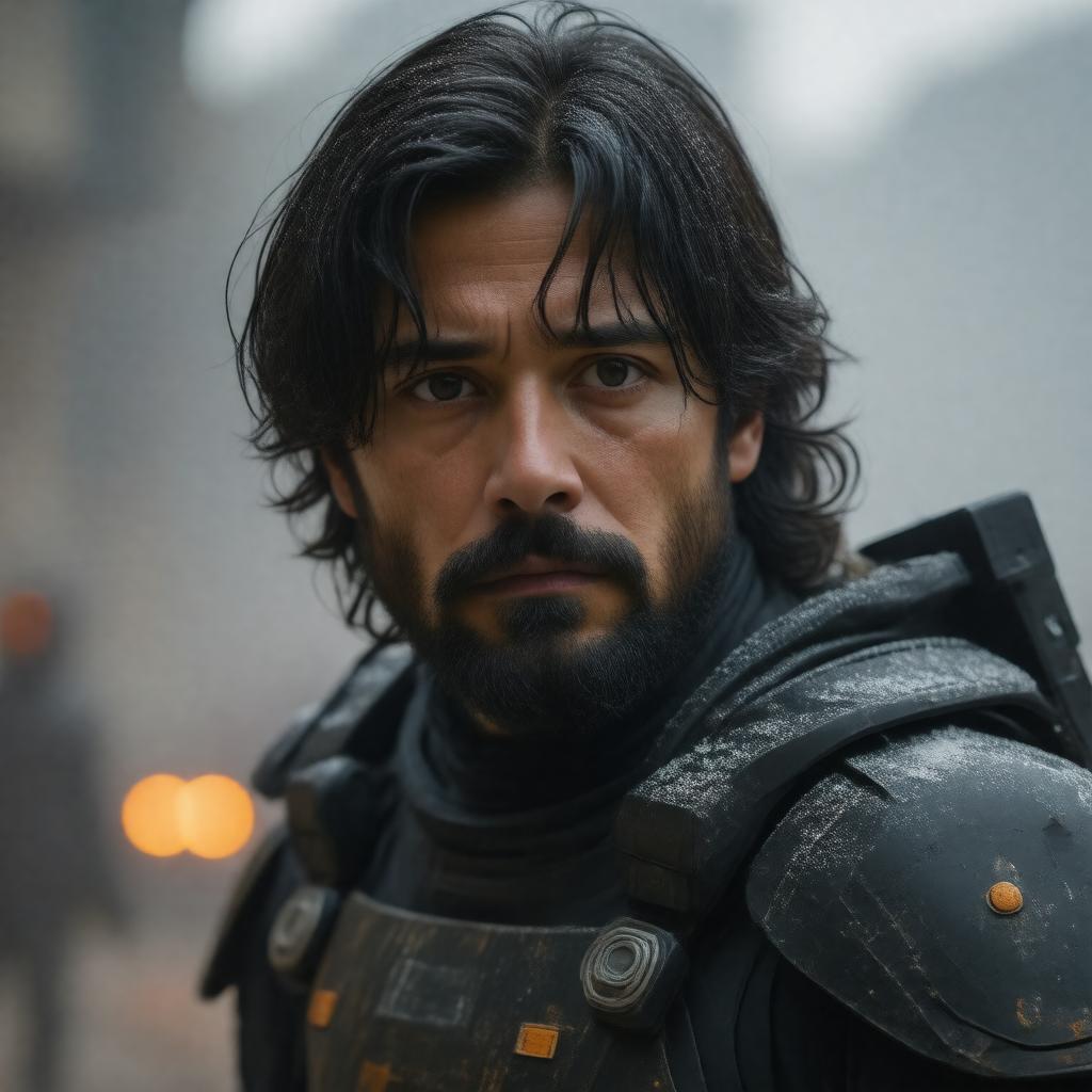 "Generate an image of the main character Cassian Andor, played by Diego Luna, in a sci-fi action-packed scene, set in the Star Wars universe, with a dark and gritty tone, inspired by the Disney+ series 'Andor', with a focus on capturing the character's determination and resilience, in a cinematic style reminiscent of the show's adventurous and suspenseful tone."