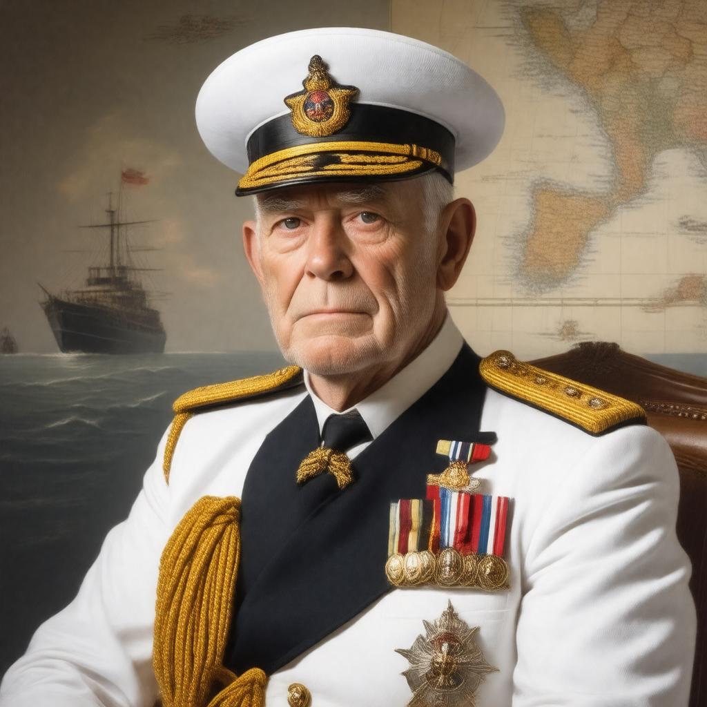 Generate a realistic portrait of a distinguished elderly British naval officer from the early 20th century, dressed in his full Admiral of the Fleet uniform, adorned with numerous medals and insignia, including the Order of the Bath, Order of Merit, Order of the British Empire, Distinguished Service Order, and Legion of Merit; he should be seated in a dignified pose with a stern yet wise expression, set against a backdrop that subtly suggests his association with the Royal Navy and World War II, such as a naval ship or a map of the Mediterranean; the style should be formal, detailed, and reminiscent of official military portraits.