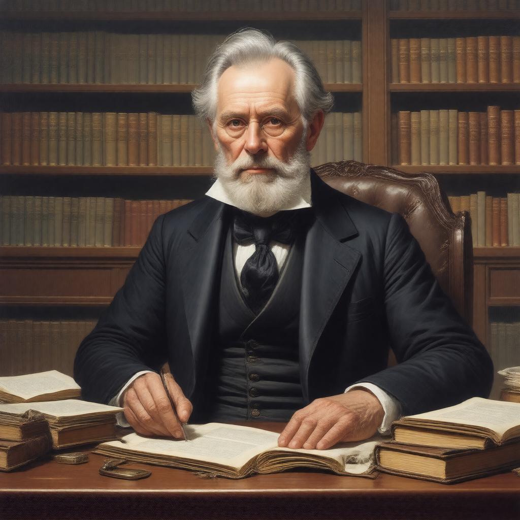 Generate an image of a 19th-century American historian, dressed in formal attire, sitting in a library with books and papers surrounding him, representing Andrew Dickson White, with a realistic style, incorporating elements that reflect his profession as a historian, diplomat, and educator.