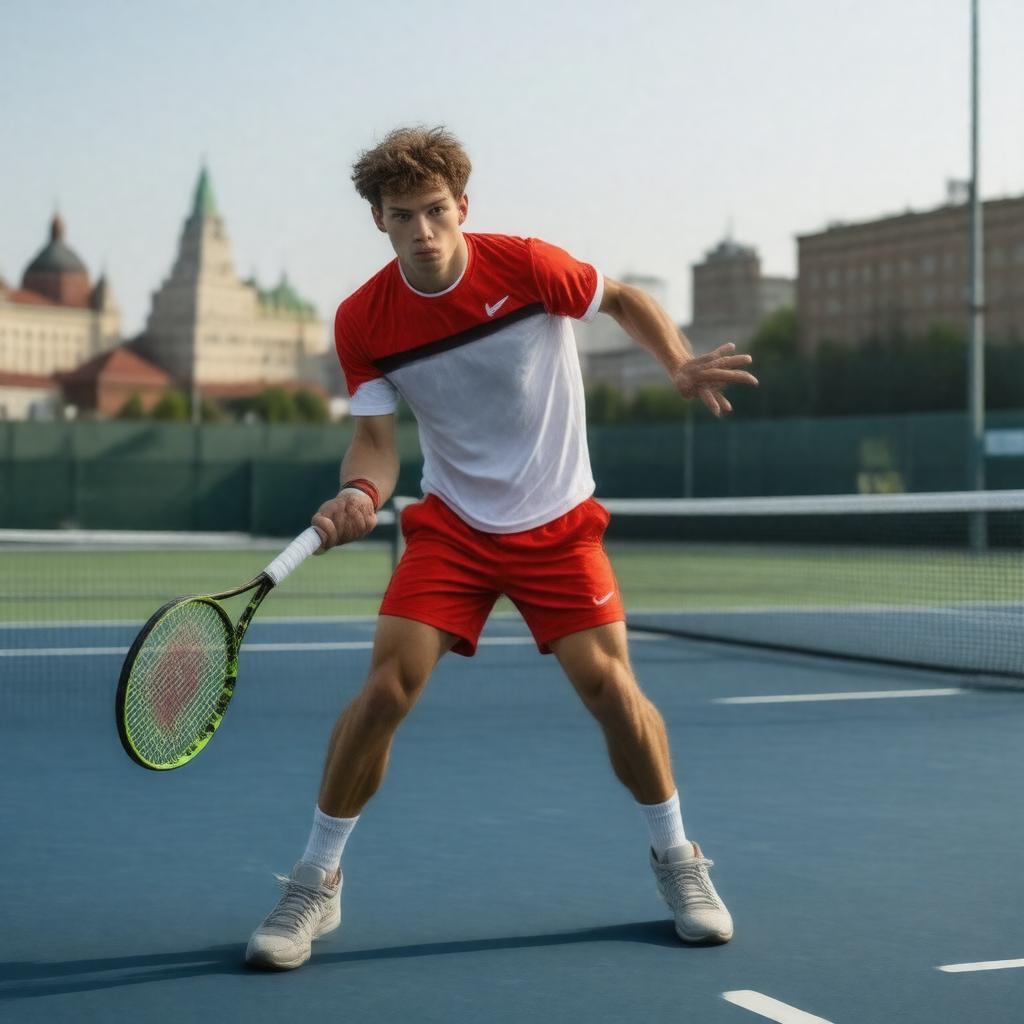 Generate a realistic image of a young, right-handed male tennis player in action, wearing a Russian tennis outfit, with a powerful forehand swing, standing on a tennis court with a Moscow cityscape in the background, symbolizing Andrey Andreyevich Rublev, the Russian professional tennis player.