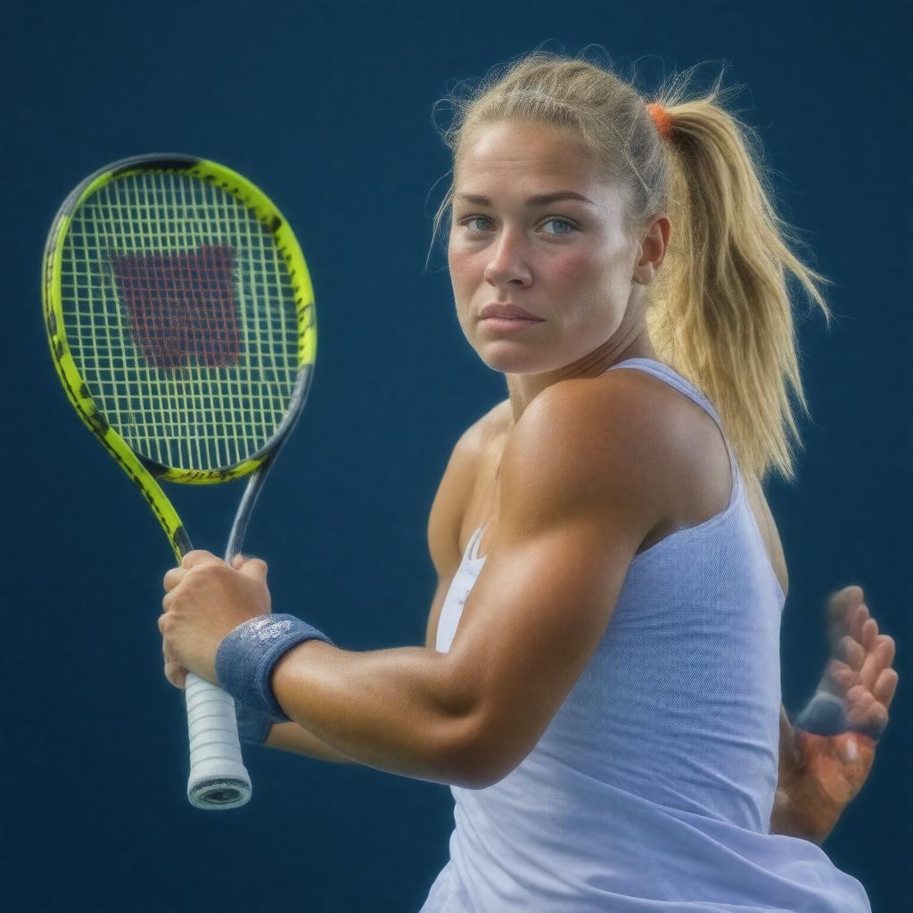 Create a realistic portrait image of Angelique Kerber, a renowned German tennis player, in her active playing style, wearing her sports attire and holding a tennis racket, possibly in mid-swing or in a victorious pose, reflecting her achievements including being a Wimbledon, Australian Open, and US Open champion, and an Olympic silver medalist, with a determined and focused expression.