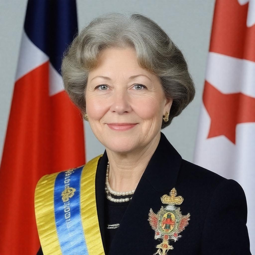 Generate a realistic portrait image of Anita Neville, a middle-aged Canadian woman with a warm smile, wearing a formal outfit, possibly with a Lieutenant Governor of Manitoba sash or a Canadian flag in the background, highlighting her dignified and accomplished personality as a politician, specifically as the first Jewish Lieutenant Governor of Manitoba.