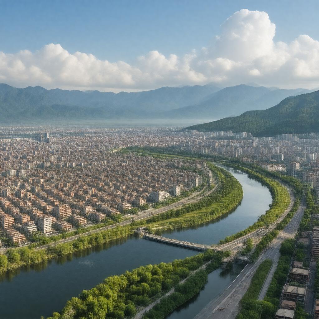 "Generate a realistic image of Ankang city in Shaanxi Province, China, showcasing its scenic landscape and urban architecture, possibly with the Han River flowing through it, surrounded by mountains and lush greenery, under a clear blue sky with a few puffy white clouds."