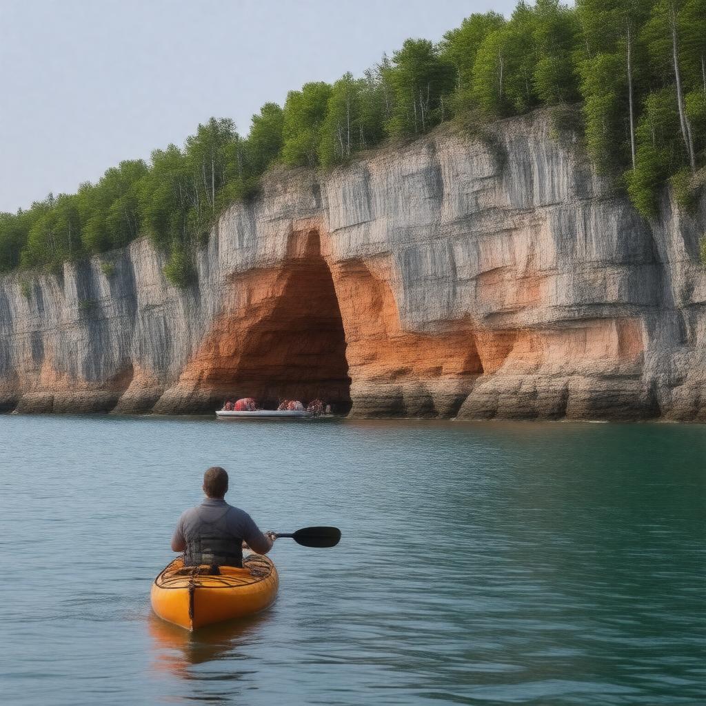 "A scenic view of Apostle Islands National Lakeshore, located on the shores of Lake Superior in Wisconsin, United States. The image features a stunning sandstone cliff with sea caves, surrounded by old-growth forests and 21 islands, including Raspberry Island, Devils Island, and Sand Island, with lighthouses standing tall. In the foreground, a kayaker paddles through calm waters, with a boat and a few campers visible in the distance. The atmosphere is serene, with a mix of sun and clouds reflecting off the water, highlighting the natural beauty and diverse wildlife habitats of this national lakeshore, a protected area managed by the National Park Service since 1970."