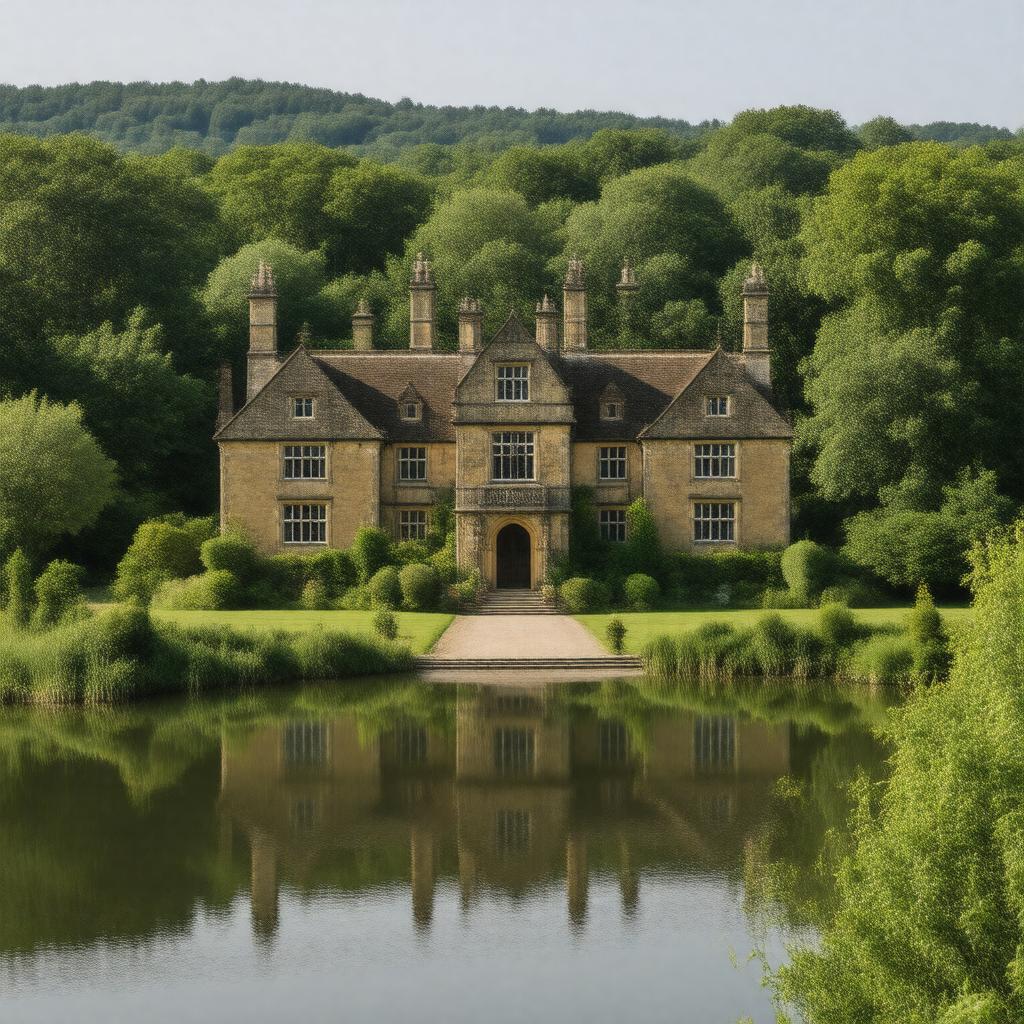 "Generate an image of a majestic Jacobean-style historic house set in the English countryside, specifically in West Yorkshire, England, representing Appleton House, a 17th-century estate built for Sir Thomas Fairfax, with architectural details characteristic of its era, surrounded by lush greenery and possibly a serene lake or river in the background, reflecting the tranquility of its rural setting in Methley."