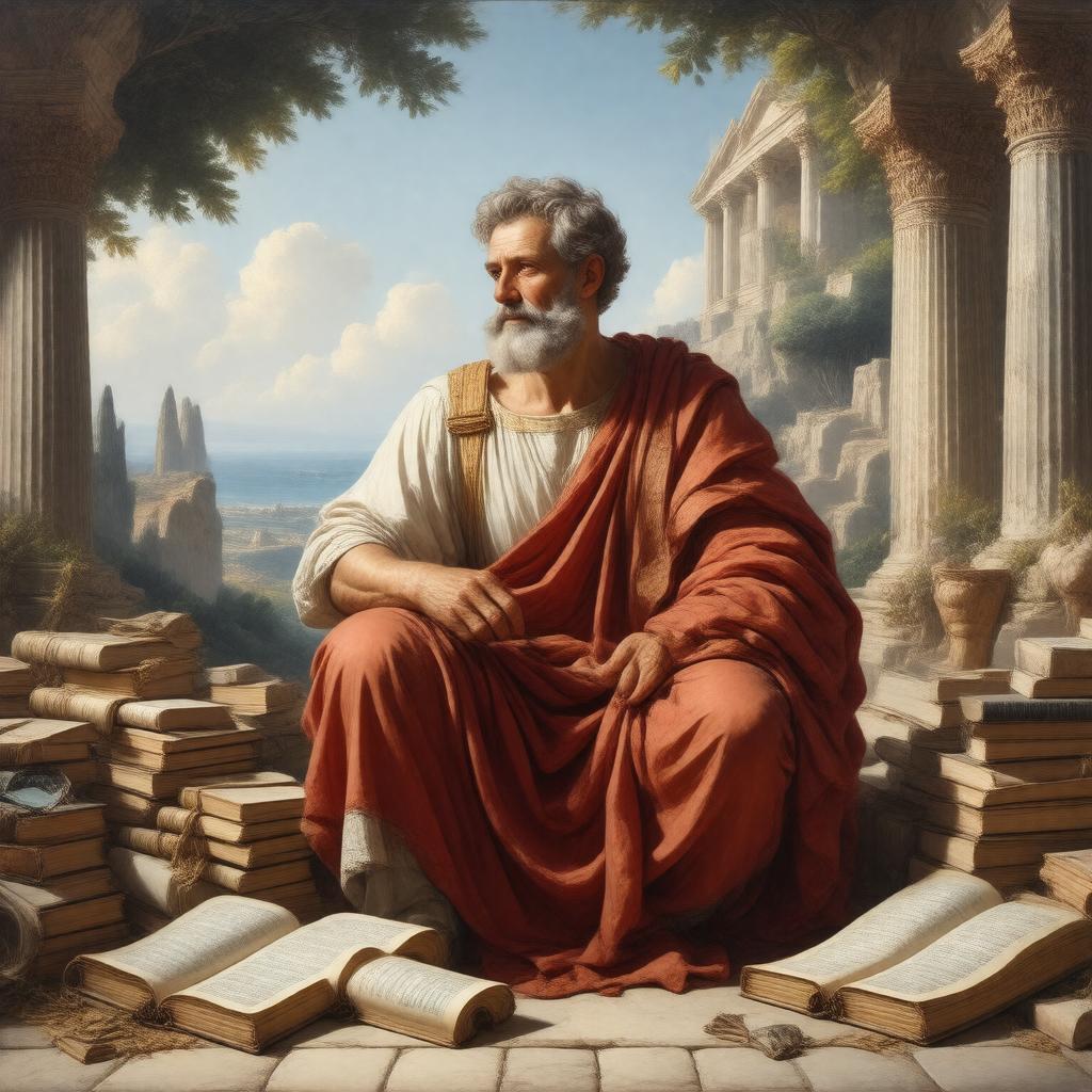Create an image of a 2nd-century Roman philosopher and writer, Apuleius, sitting in a contemplative pose amidst ancient scrolls and tomes, with a backdrop of a Mediterranean landscape, possibly inspired by the North African region where he was born in Madaurus, reflecting his connection to Platonism, and his notable works such as 'The Golden Ass', in a realistic yet classical art style reminiscent of ancient Roman portraiture.