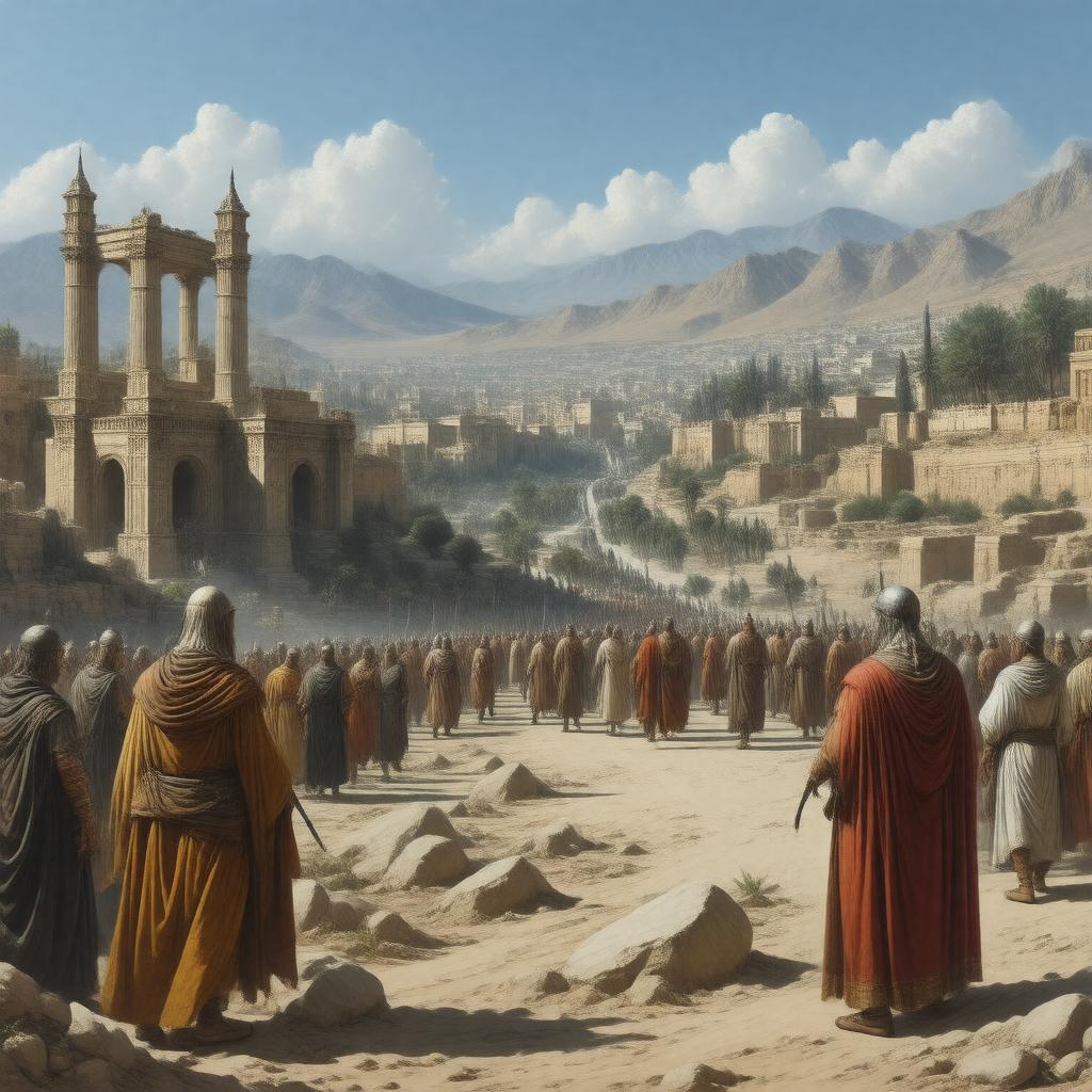 "Generate an image of a ancient Near East landscape with a cityscape in the background, featuring a mix of Aramaic script and architecture, with people dressed in traditional attire of the Late Bronze Age or Iron Age, possibly with a notable figure such as Hazael or a king of Aram-Damascus in the foreground, surrounded by symbols of the Ancient Semitic religion, with Damascus or Hamath in the distance, in a realistic style."