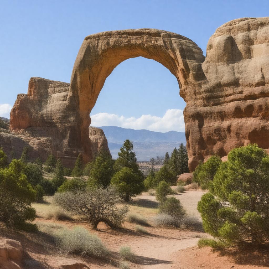 "Generate an image of a breathtaking landscape of Arches National Park, a nature reserve located in eastern Utah, United States. The image should feature a iconic natural sandstone arch, such as Delicate Arch or Landscape Arch, set against a clear blue sky with the sun casting a warm glow on the surrounding high desert terrain, with juniper and pinyon pine trees scattered in the foreground. The style should be photorealistic, capturing the intricate details of the Entrada Sandstone and Navajo Sandstone formations, and conveying a sense of vastness and serenity."