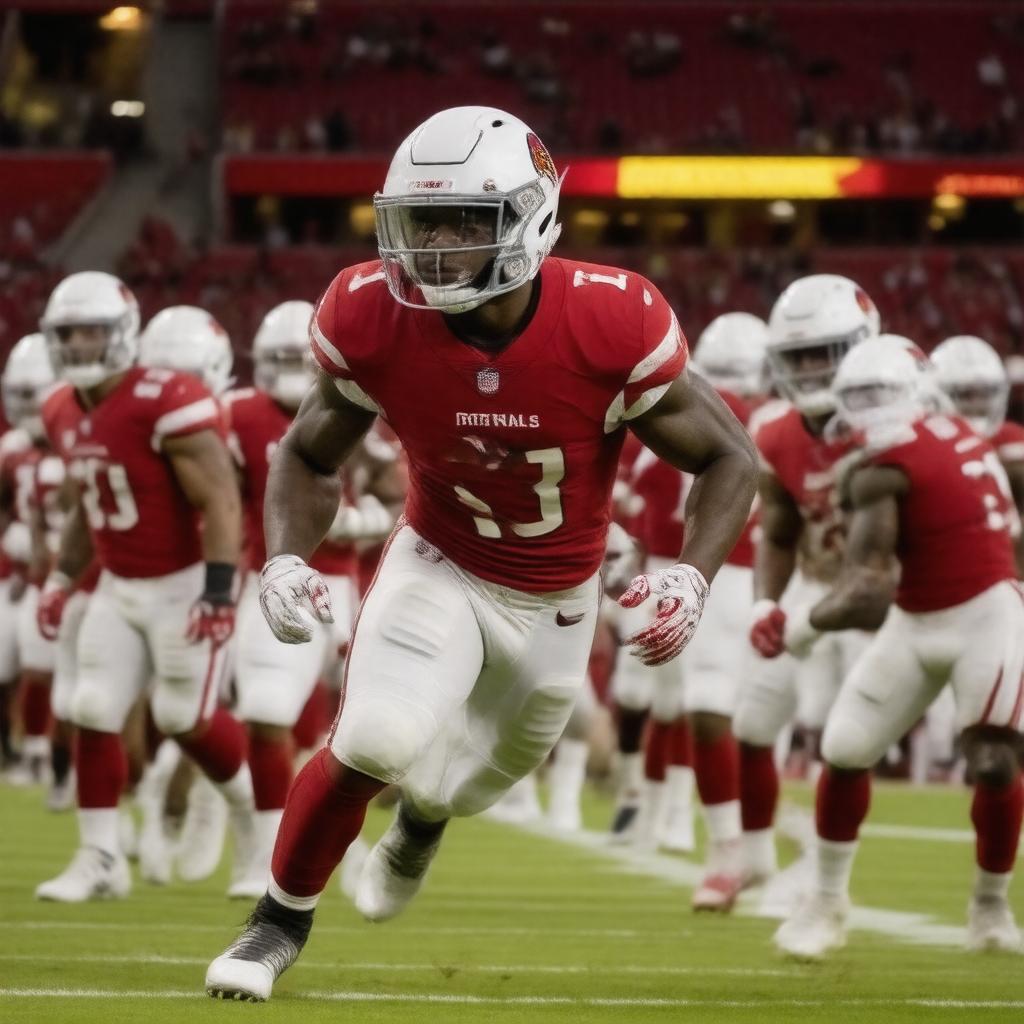 "Generate an image of the Arizona Cardinals American football team, specifically a realistic depiction of the team's logo or a scene of the team in action at State Farm Stadium in Glendale, Arizona, incorporating the team's colors red, white, and black, with a style that blends sports photography and team branding."