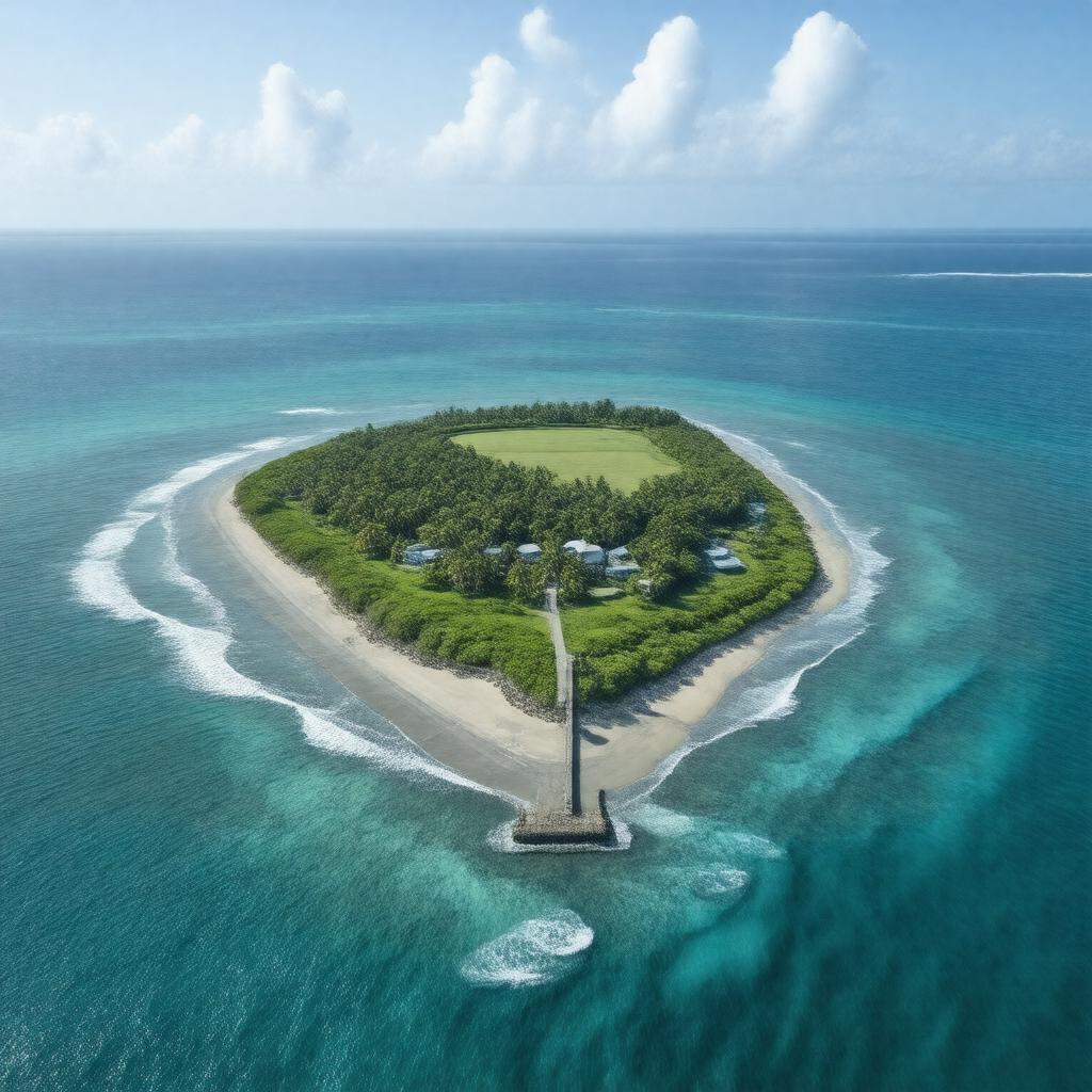 Generate a realistic aerial view of Arorae Island, showcasing its small landmass surrounded by the Pacific Ocean, with a few buildings, including the Arorae Protestant Church and Arorae Old Slipway, and a runway for Arorae Airport, under a bright tropical sky with a few clouds, in a photorealistic style.