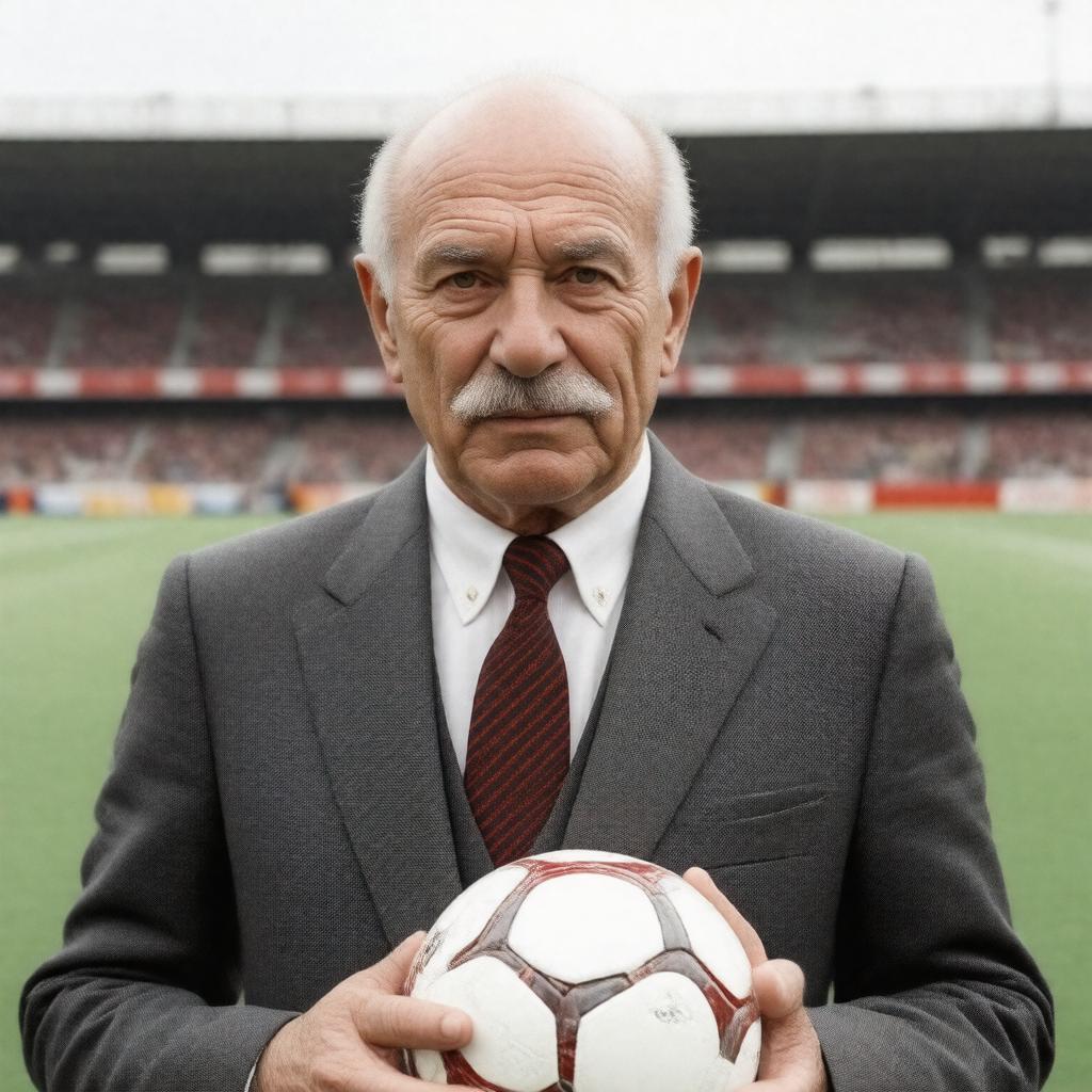 Create an image of a middle-aged Italian man with a distinctive mustache, wearing a suit and holding a football or standing in front of a football field, representing Arrigo Sacchi, the renowned Italian football manager and former player, with a background that reflects his achievements and legacy in football, such as a subtle image of the AC Milan team or the Italian national team.
