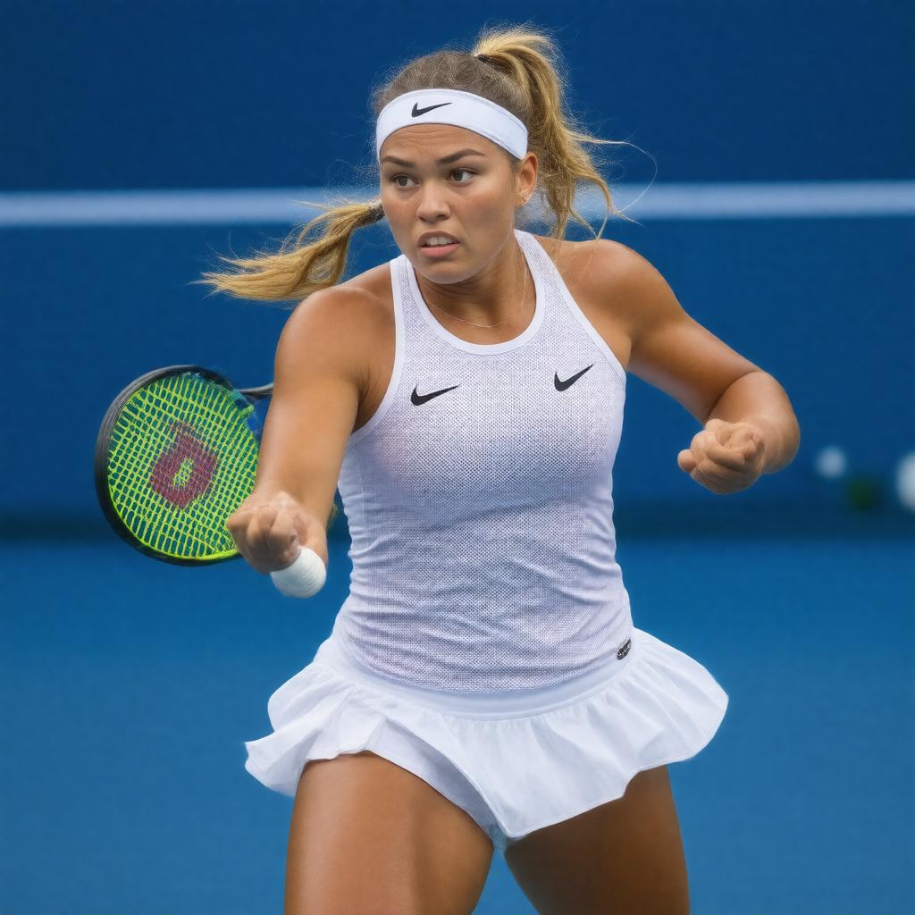 "Generate a realistic image of Aryna Sabalenka, a professional tennis player, in action on the court, wearing her Nike and Wilson sponsored tennis outfit, with her powerful serve in mid-motion, showcasing her aggressive baseline play style, with a determined expression on her face."